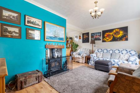 A superb light dual aspect room with feature woodburning stove, double glazed windows to front and rear, ample dining space.
