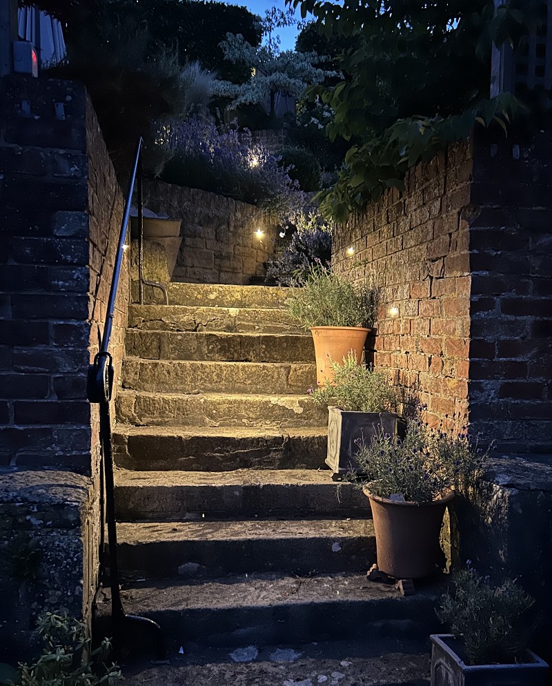 Antique stone flagged area over which there is access for three other houses. Steps leading to private garden.