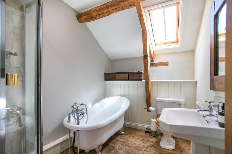 Solid elm floor and four piece suite in white. Low flush WC with oak style seat, free standing roll top single bath, with chrome shower attachment and mixer tap, pedestal wash hand basin and delta shaped shower cubicle to one corner with fired earth style tiling, hand held shower attachment and glazed doors. Three inset spot lights to the ceiling, access to loft space, exposed roof timbers and purlins, double glazed Velux swing window and a single radiator.