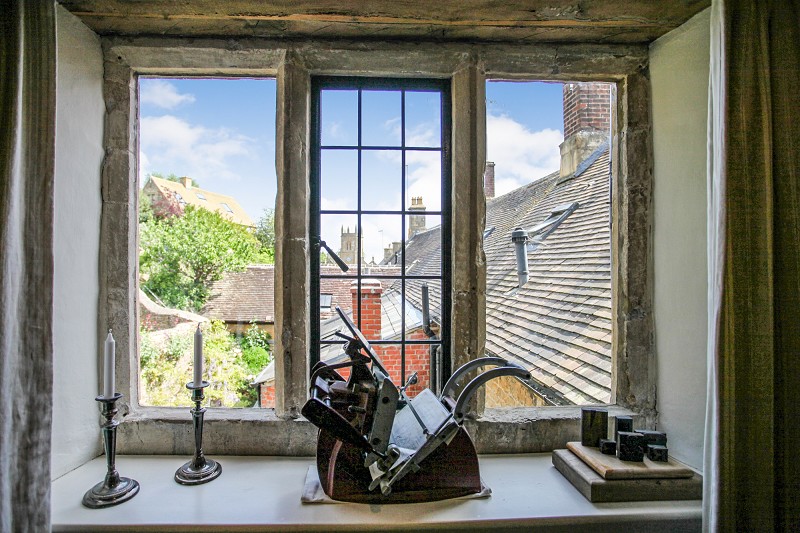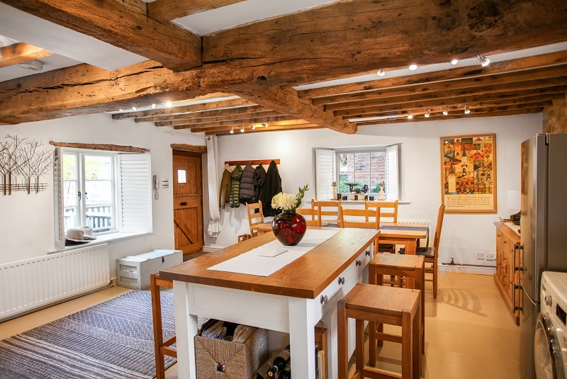 Bespoke kitchen, fitted on three sides with solid oak work tops with inset one and a half enamel sink unit with chrome swan necked mixer tap. Six individual base units with corner pantry cloaks cupboard housing a Worcester combination boiler for instantaneous hot water and gas fired central heating. A particularly attractive room with substantial oak beams and battened ceiling, substantial oak lintel over mullioned window with leaded panes, and a northerly aspect over courtyard. Windows also to south and west with built in double shutters to each window. Wall mounted circuit breaker unit, two single radiators. Exposed stone wall to one side of the room, 14 power points, space for dishwasher and space for washing machine, space for tumble dryer and fridge freezer. Substantial Black Britannia range with 6 ring gas hob with double electric oven below, double canopied cooker hood above with stainless steel splash back. Stable style oak back door with bullseye inset and intercom system to door adjoining high street. Individual dimmer switches to each of the spot tracks, easy retuning staircase leading to first floor living room. The floor in this room has been recreated to incorporate substantial extra insulation.
