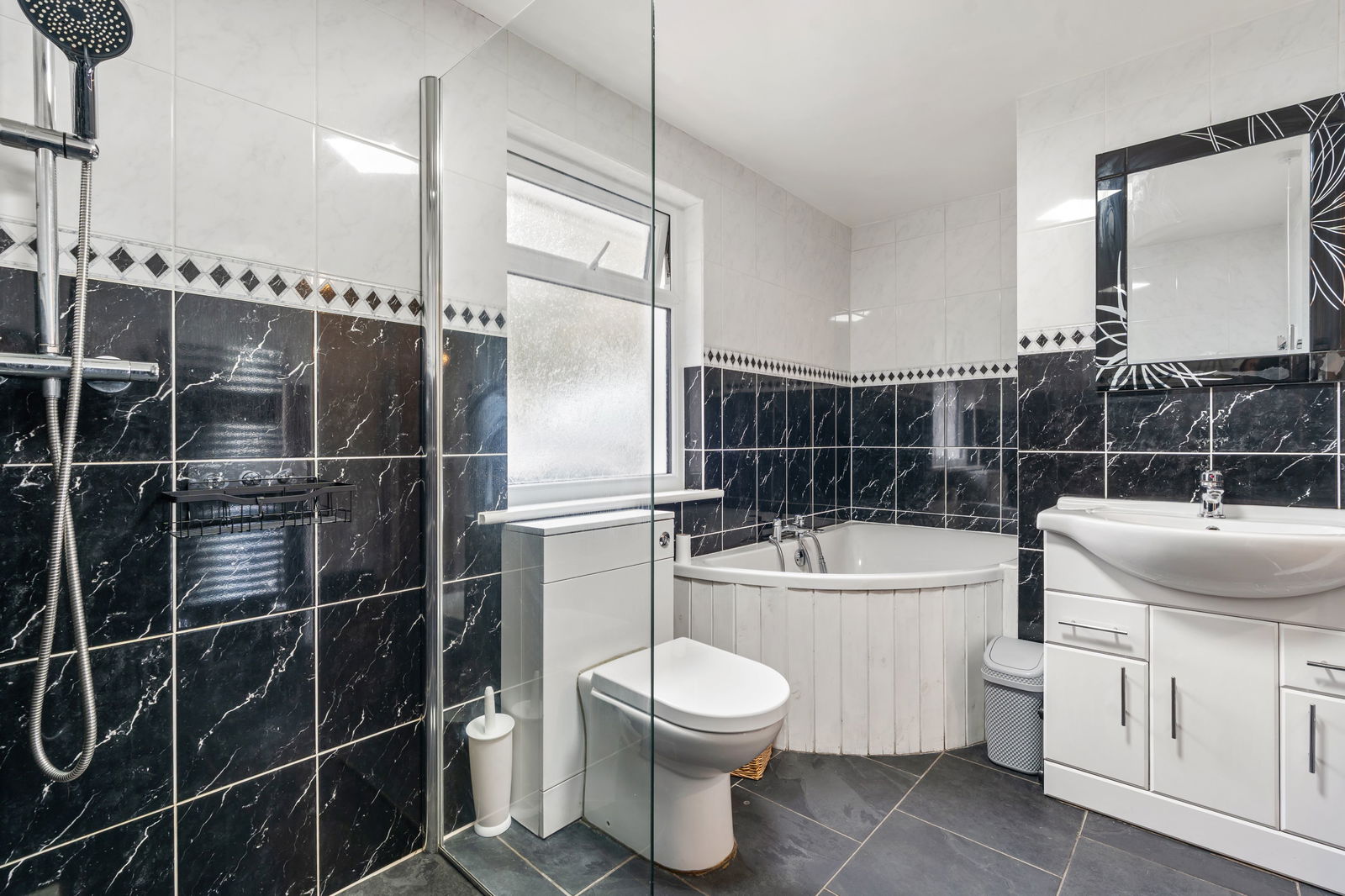 Fully tiled. Fitted in suite comprising spacious corner bath with shower fitting, low level w.c., wash hand basin with vanity storage cupboards below and large walk in shower enclosure with rainfall shower head. Heated towel rail. Underfloor heating. Slate flooring. Opaque UPVC double glazed window to front.