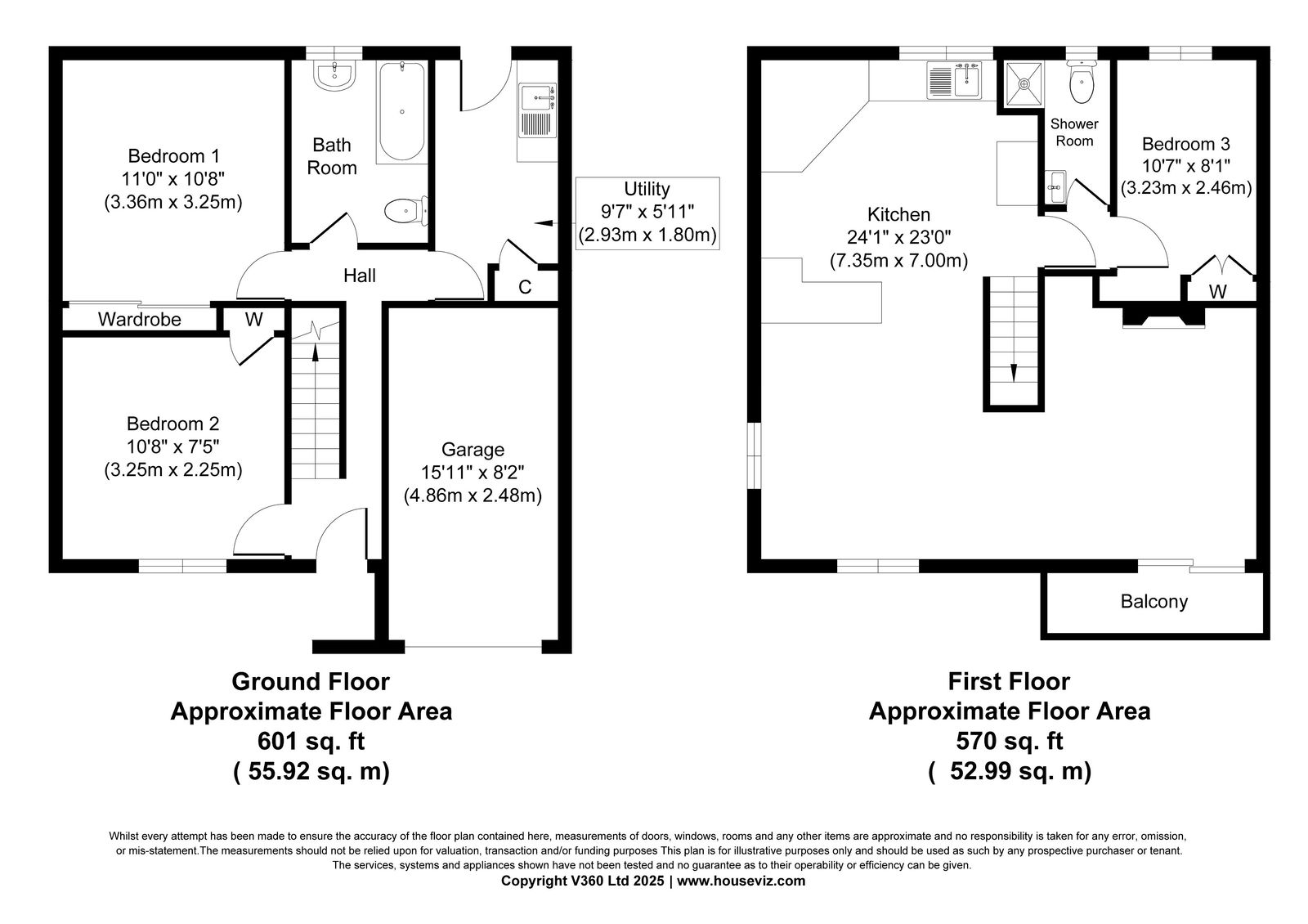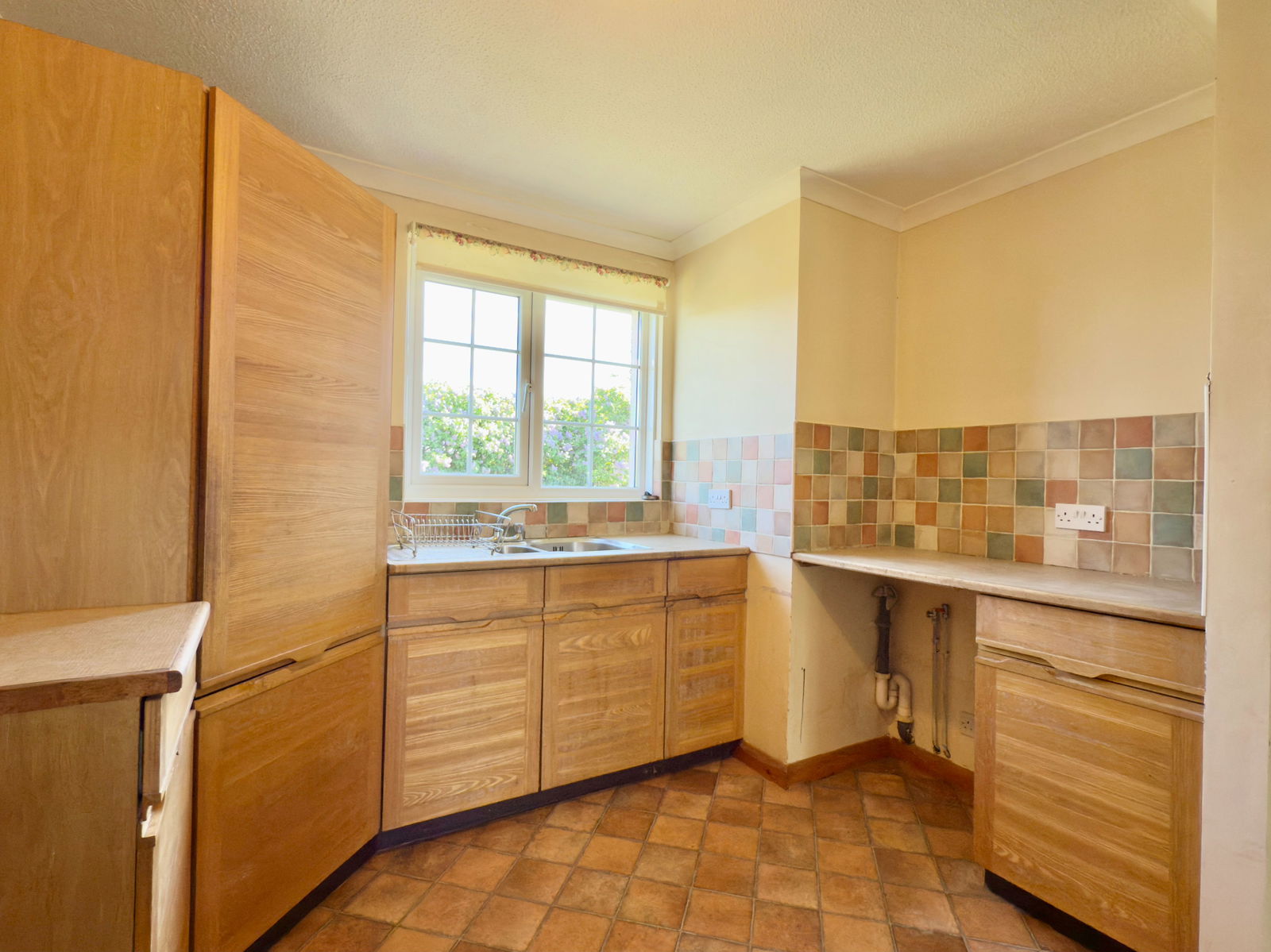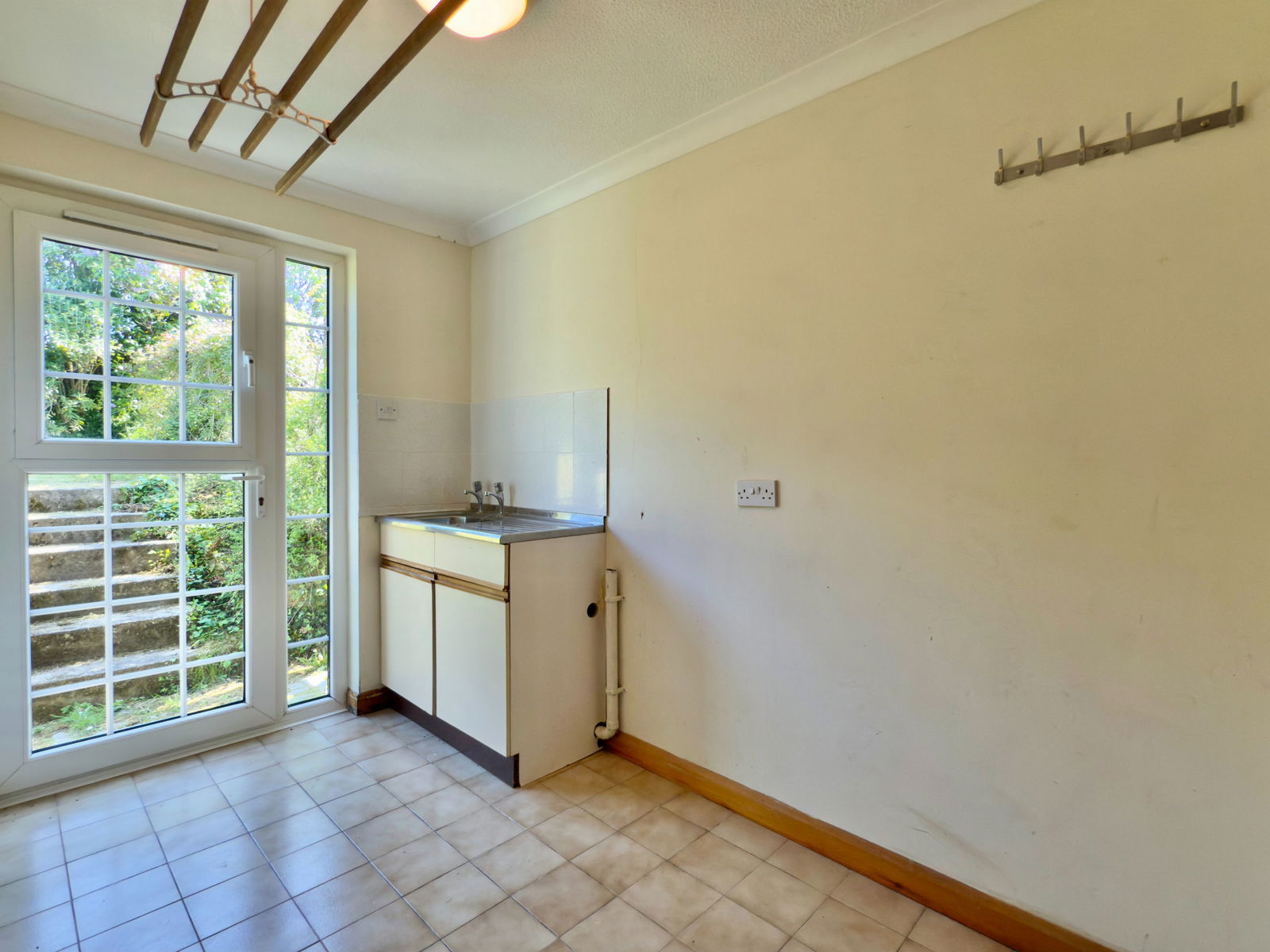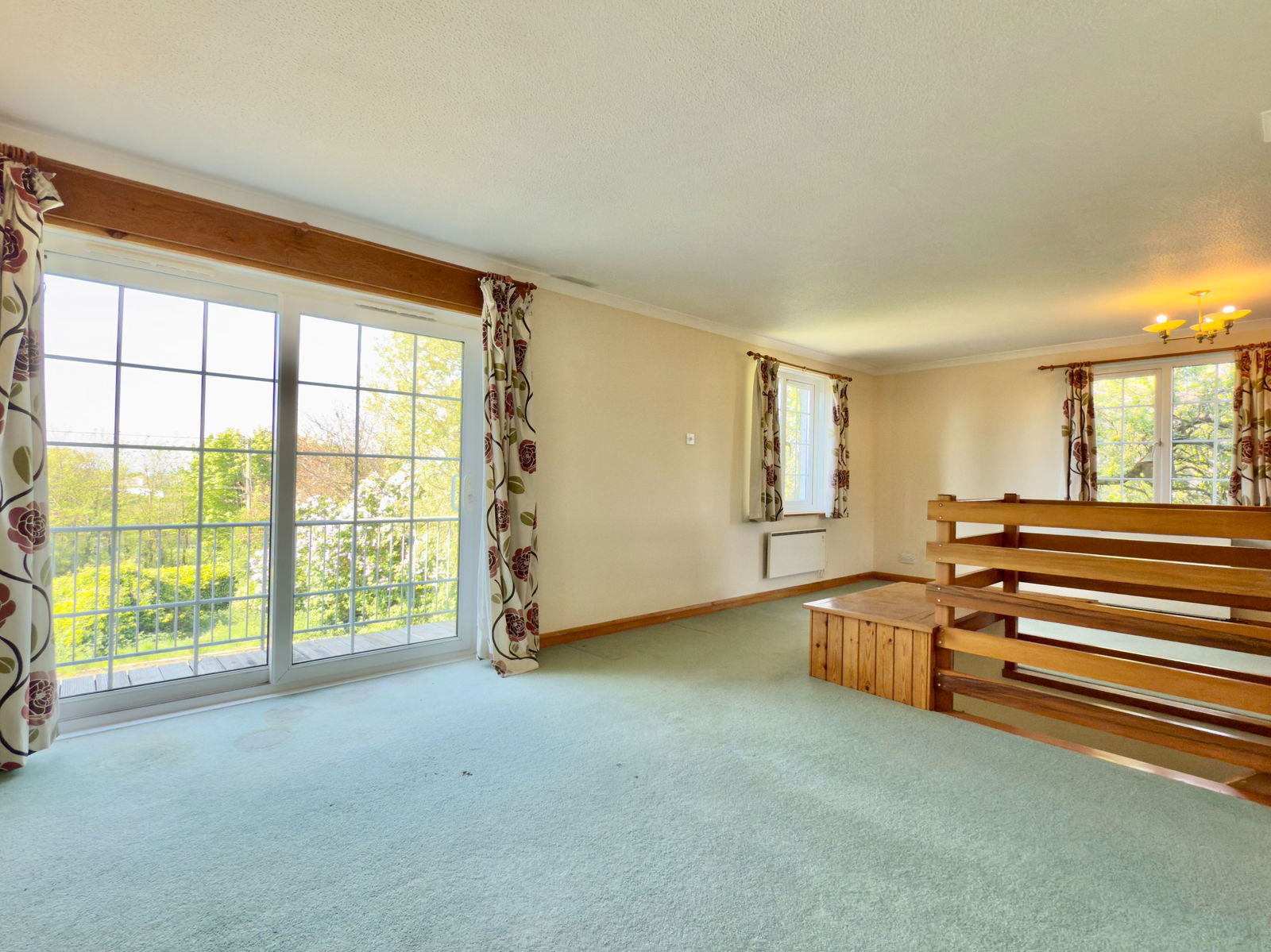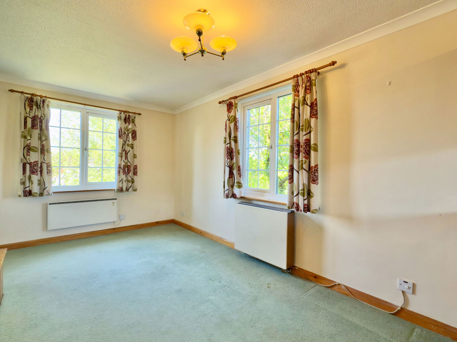 The front door leads into the hallway, where the stairs lead you up to the open plan living room, off the hallway on the ground floor are two double bedrooms and a bathroom with electric shower over the bath. There are night storage heaters to the hall way and bedrooms as well as an electric towel rail and a wall heater in the bathroom. At the rear of the property is a utility room with sink and space for a washing machine with a glazed uPVC door and side glazed panel to the rear garden. The airing cupboard with hot water tank is also in the utility room. On the first floor is an open plan kitchen/living room which being end of terrace it is triple aspect having a pleasant outlook in every direction. The living area has a fireplace and patio doors out onto a balcony.