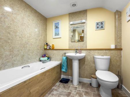 A spacious modern part tiled suite with panelled bath, low level W.C., wash hand basin, opaque UPVC double glazed window to rear, underfloor heating, heated towel rail, opaque UPVC double glazed window to rear.