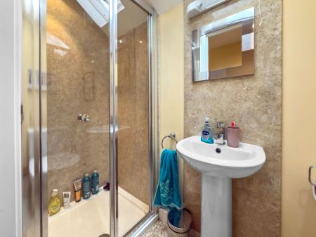 Shower cubicle with rainfall shower head and tiled surrounds, low level W.C., wash hand basin with tiled splashback, heated towel rail, opaque UPVC double glazed window to rear.