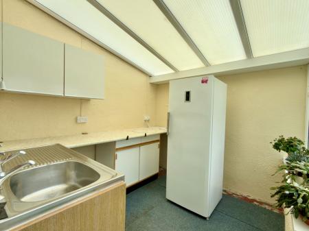 A spacious entrance porch/utility with stainless steel sink and drainer, wall and base cupboards with worktops over, space and plumbing for washing machine, space and power for tumble dryer and space and power for fridge/freezer.