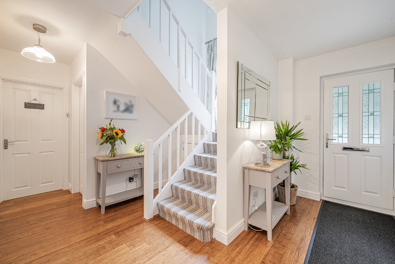 A charming half-paned leaded UPVC door opens into a bright, airy hallway with hardwearing bamboo flooring and a staircase to the first floor. Thoughtfully designed storage includes an understairs cupboard ( housing boiler) and double doored cupboard (housing water tank, which is solar compatible).