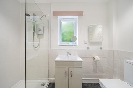 4' 5" x 6' 8" (1.35m x 2.03m) This en suite is smartly appointed with a fully tiled double shower cubicle featuring an electric shower and extractor for ventilation. Additional fittings include a low-level W.C., wash hand basin, low-voltage lighting, and a heated towel radiator.
