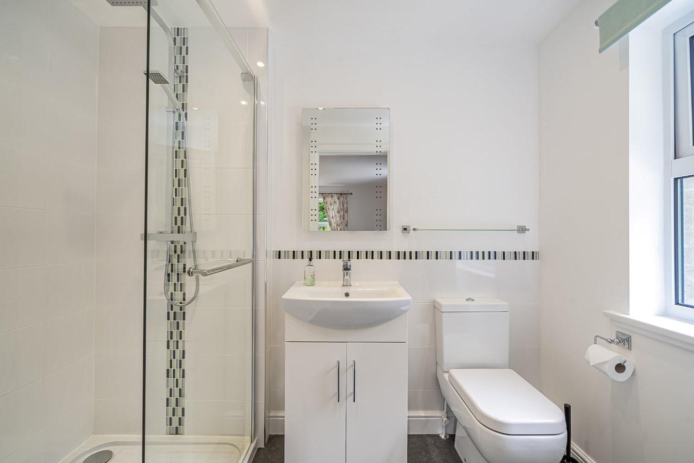 This contemporary en suite features a sleek white suite, including a spacious double shower enclosure with electric shower, vanity wash hand basin, towel radiator and low-level W.C.