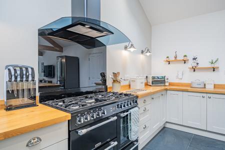 31' 6" x 16' 6" (9.60m x 5.03m) A stunning, light-filled living space showcasing an impressive vaulted ceiling with exposed timber A-frames and Velux roof windows that flood the room with natural light. The striking glass gable end with French doors creates a seamless connection to the garden, perfect for indoor-outdoor living. At its heart, a Shaker-style kitchen offers ample base units and a central island with space and plumbing for appliances including a range cooker?combining style, practicality, and sociable open-plan design.