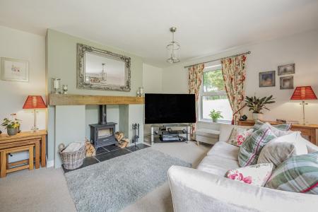 18' 6" x 13' 1" (5.64m x 3.99m) This inviting room blends indoor comfort with seamless outdoor connection. A side window and elegant French doors open directly to the rear garden, creating a natural flow for entertaining or relaxing. At its heart, a striking open fireplace with recessed wood burner, framed by a substantial wooden mantel and slate hearth, adds warmth and character?perfect for cosy evenings inside or hosting gatherings that spill out into the garden.