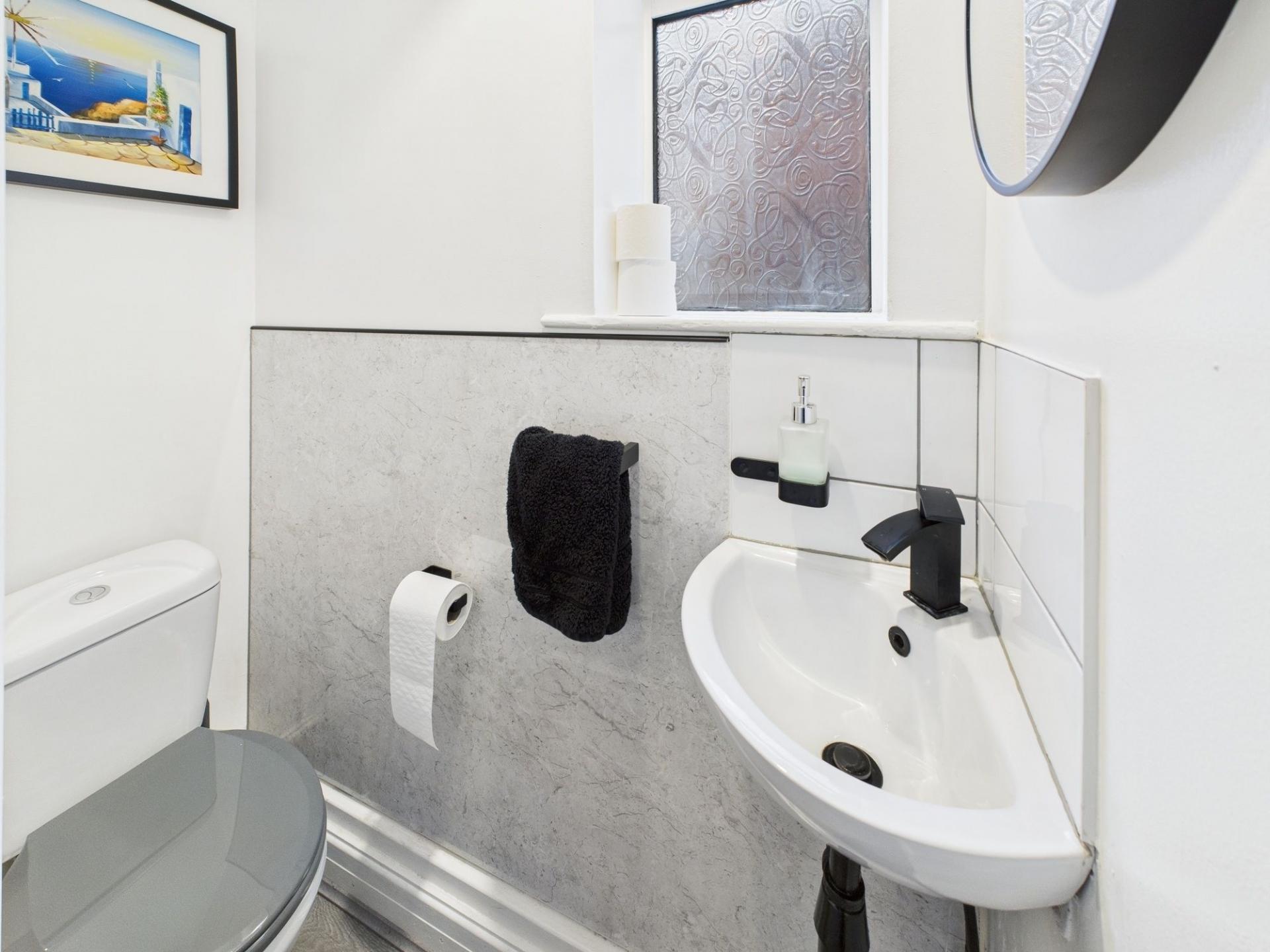 - Fully Tiled Family Bathroom With Elegant Matt Black Fixtures