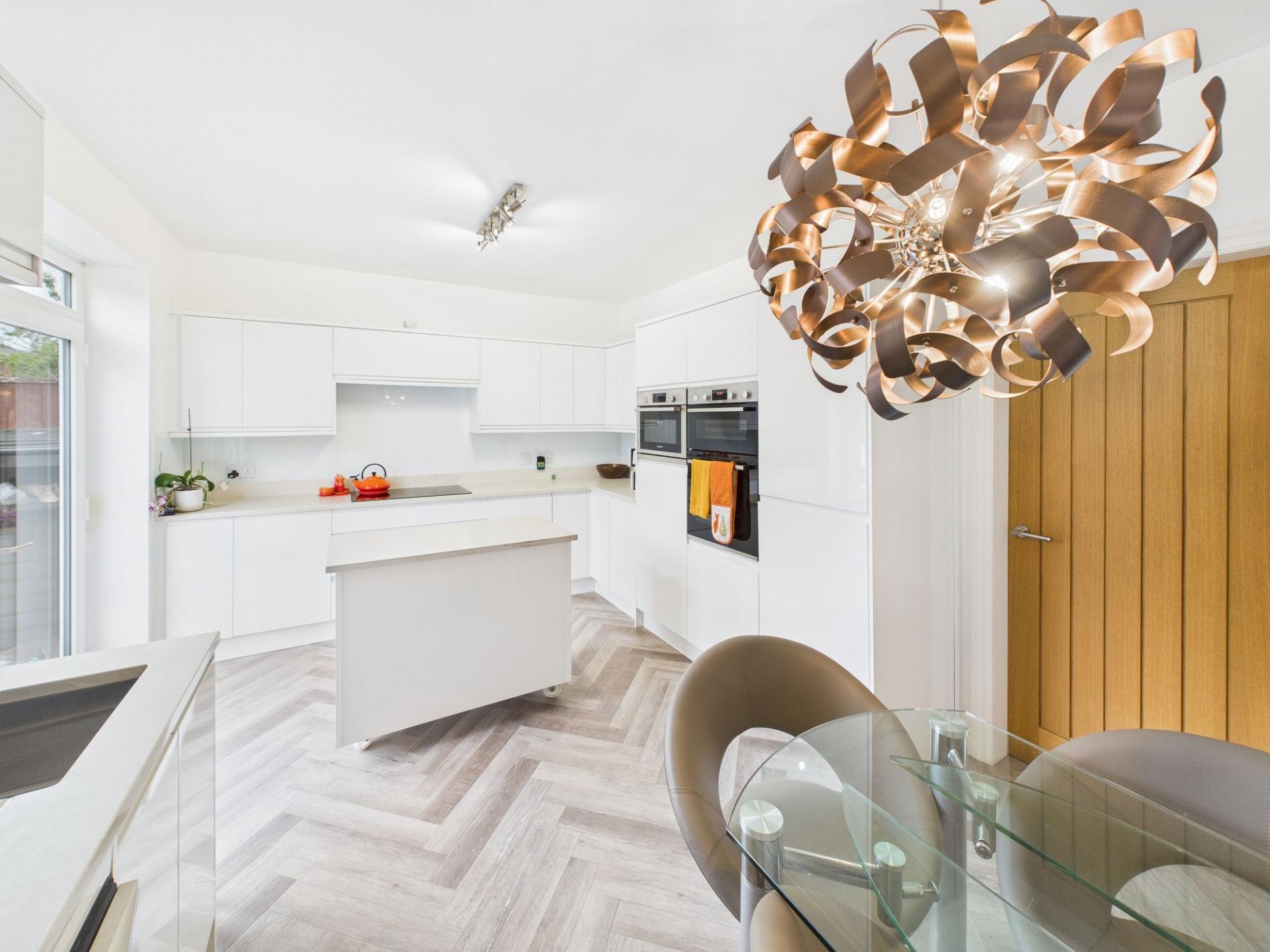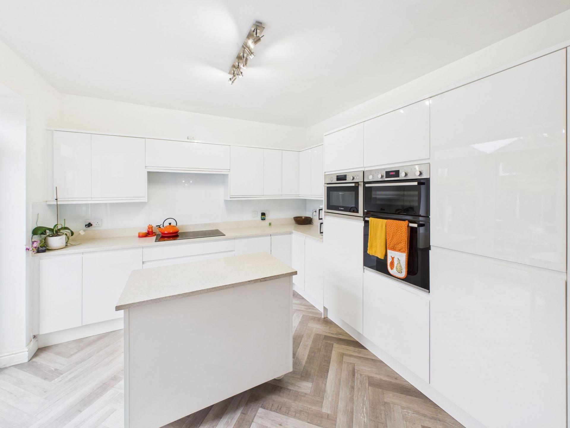 - Modern White Gloss Kitchen with Conglomerate Worktops and Integrated Appliances