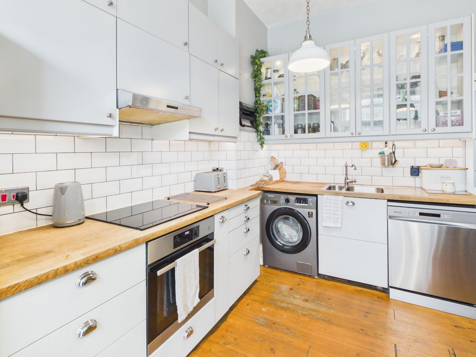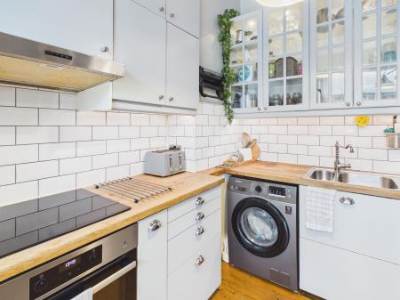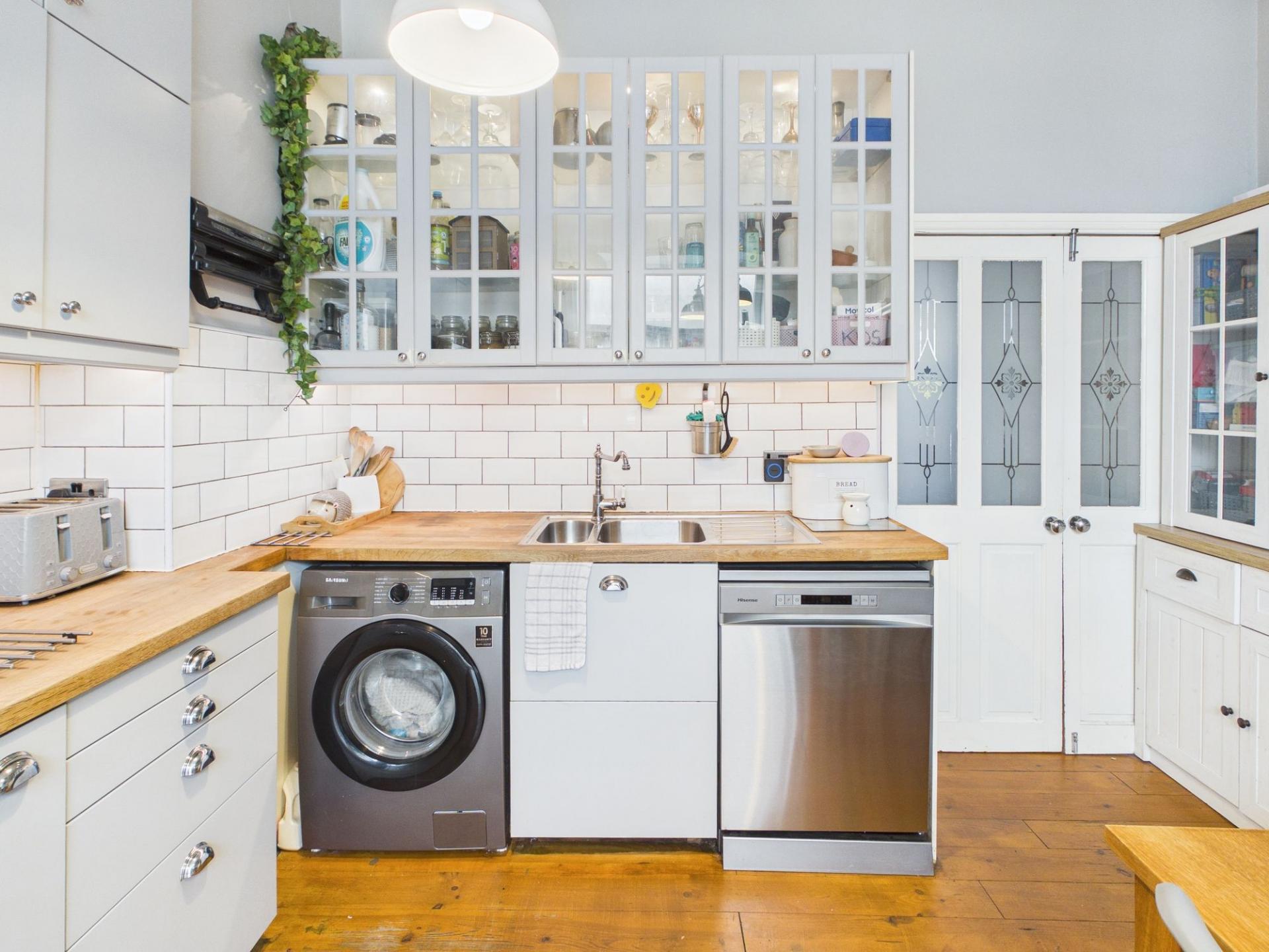 - Modern Kitchen with Integrated Appliances, Metro Wall Tiles and Glass Fronted Cupboards.