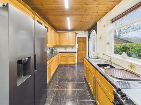 - Solid Wood Kitchen with Stainless Steel Sink and Arched Rear Door.