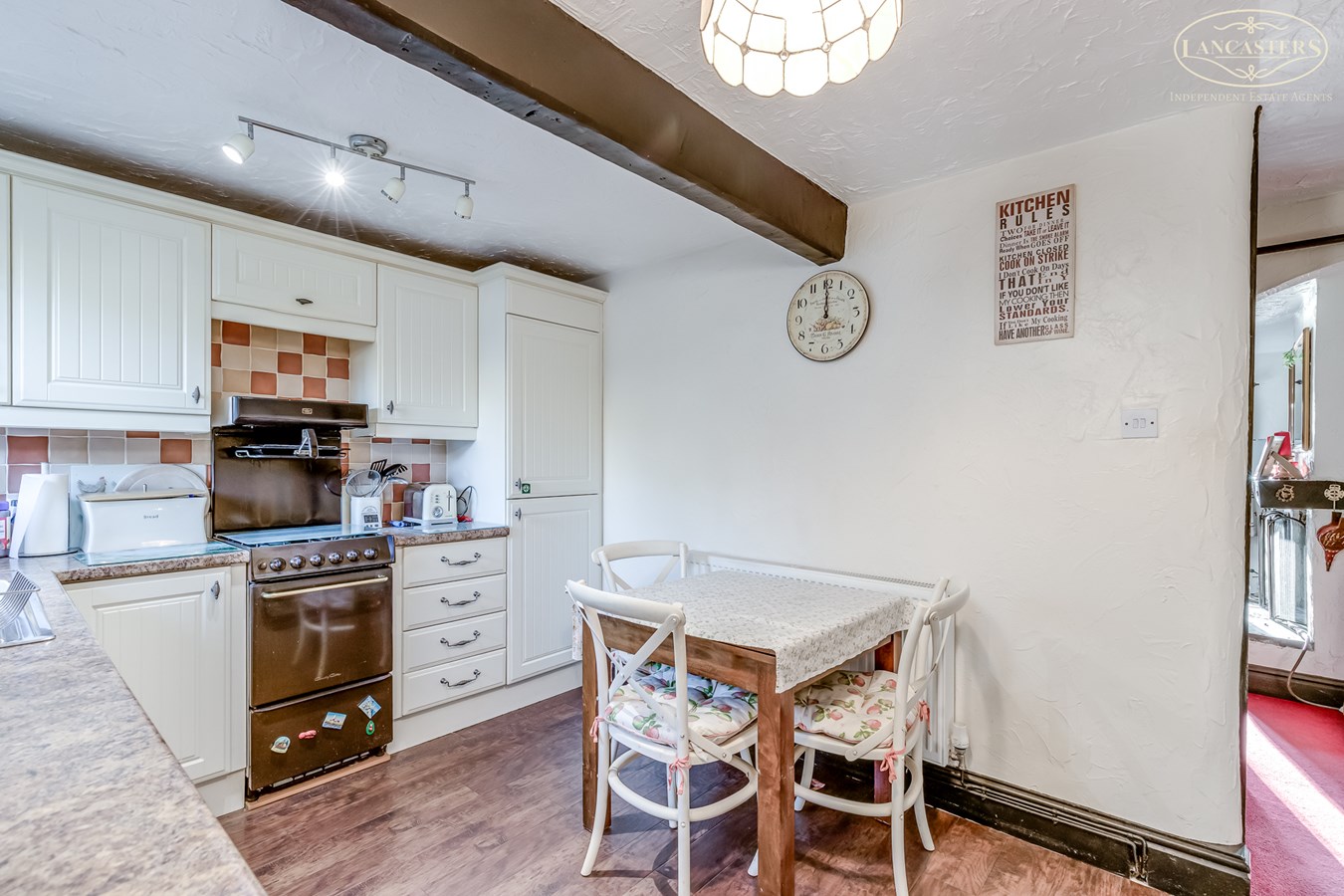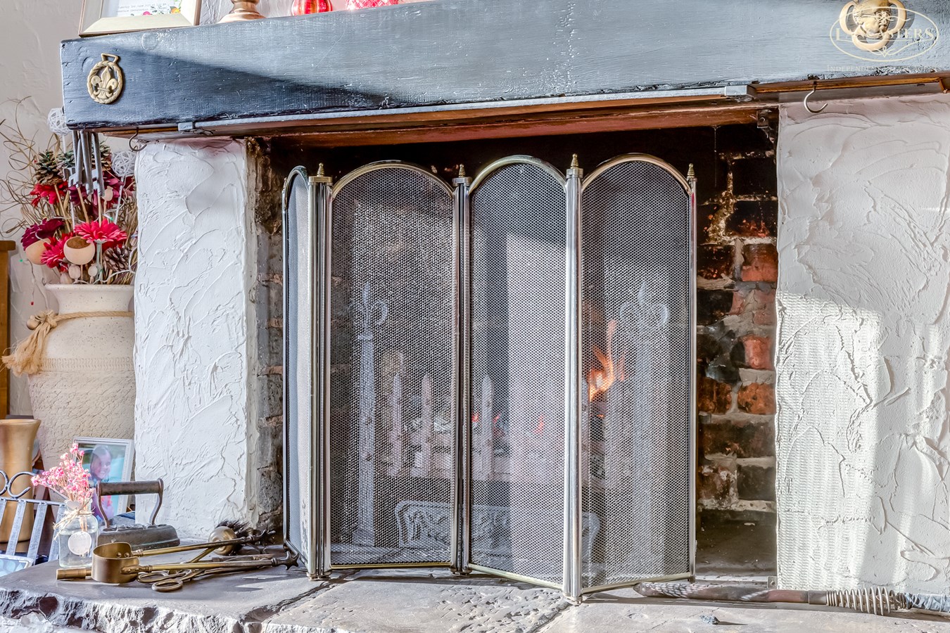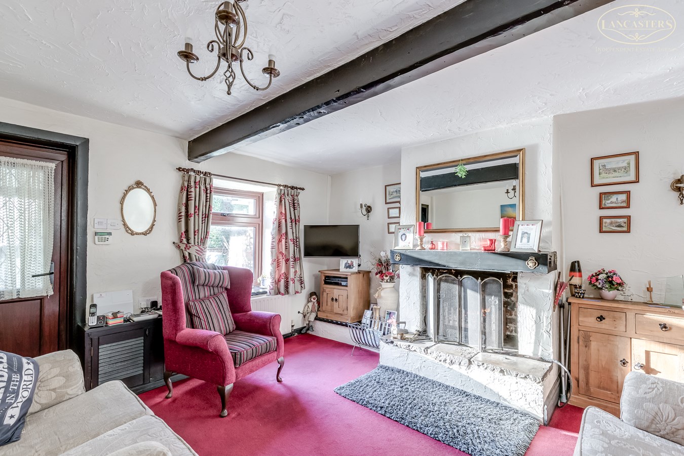 - Character features including exposed beams and an open fireplace
