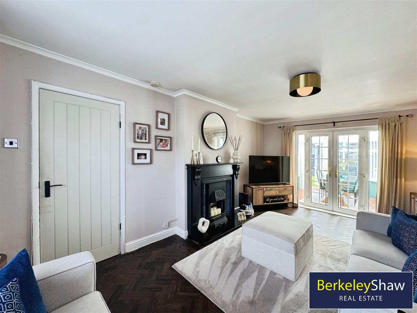 Step inside to an inviting entrance hall, which leads to a tastefully decorated living room featuring a stylish feature fireplace and double doors opening into a bright rear conservatory-currently used as a dining room and ideal for entertaining or family meals.
