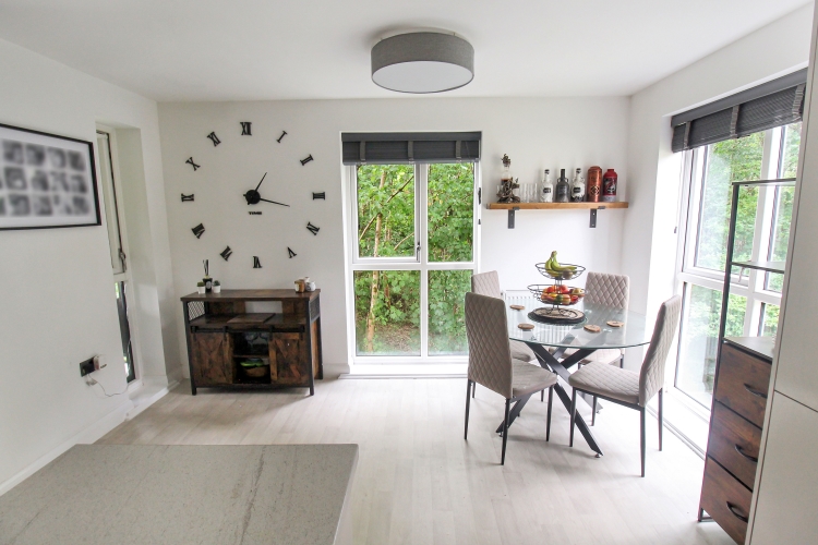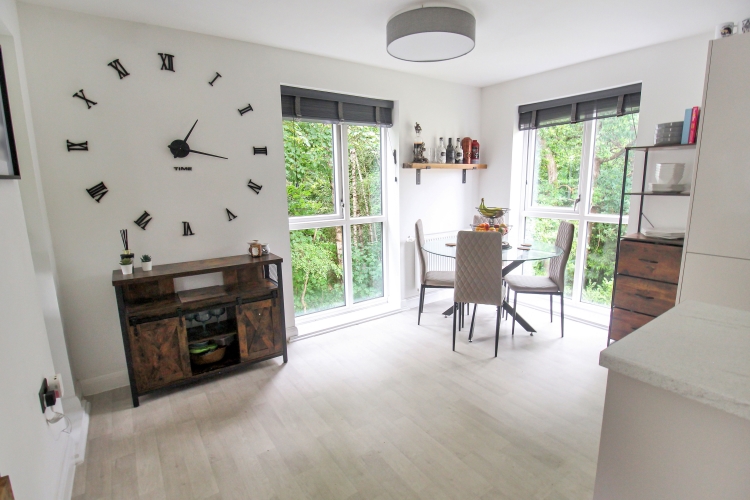 The main ‘ living ’ area of the property is set to the rear with views stretching over woodland and greenery. From the lounge area there is the feature covered balcony that not only lets in an abundance of light it also offers space for sitting and dining. The dining area of the property flows from the lounge and the kitchen area and is set so that it is in the core of the living and entering areas.