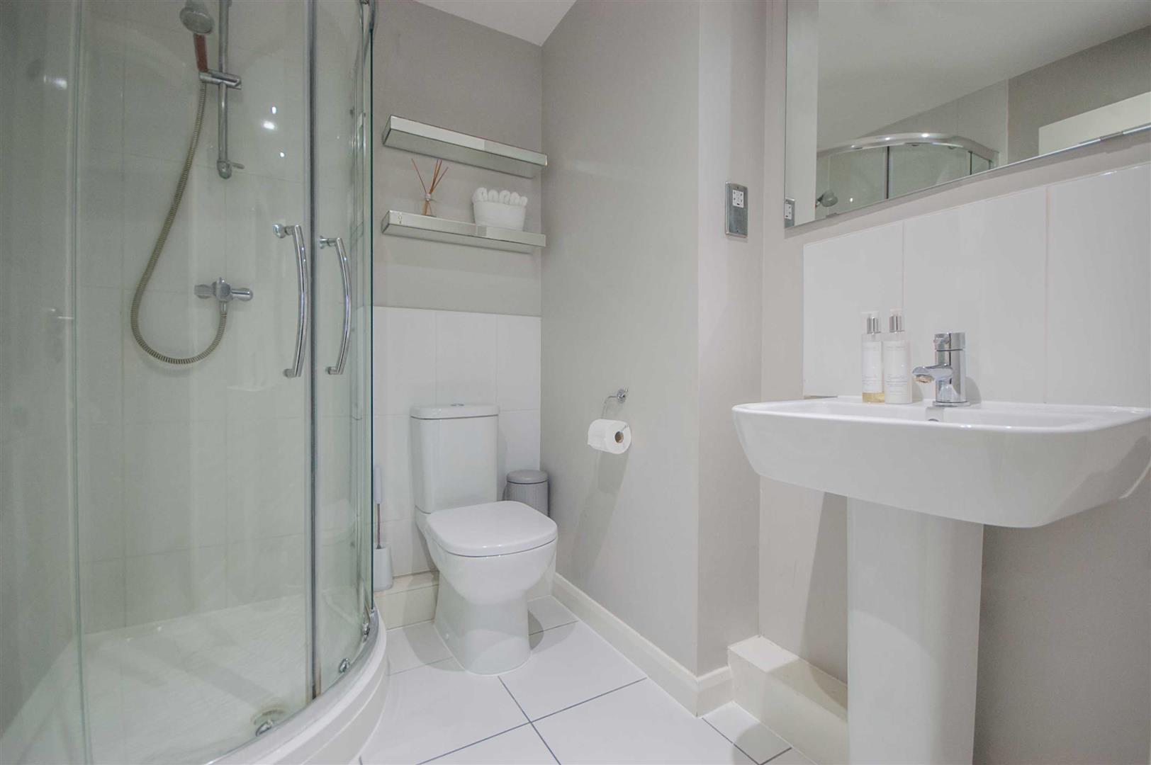 En-Suite: - 1.93m x 1.75m (6'4" x 5'9") - Fully tiled shower cubicle, low level W/C, pedestal hand wash basin, chrome towel radiator, part tiled walls, tiled flooring.