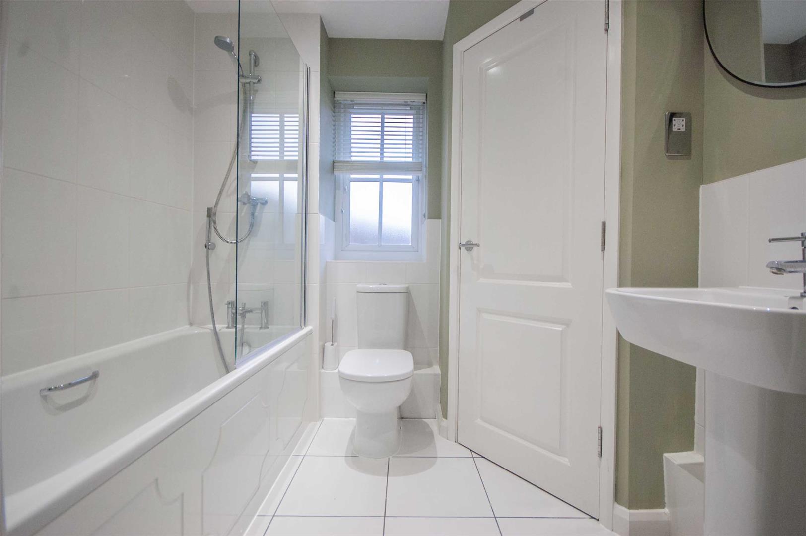 Family Bathroom: - 2.21m x 1.85m (7'3" x 6'1") - Obscure double glazed window to rear, panel bath with shower over, low level W/C, pedestal hand wash basin, chrome towel radiator, cupboard, part tiled walls, tiled flooring.
