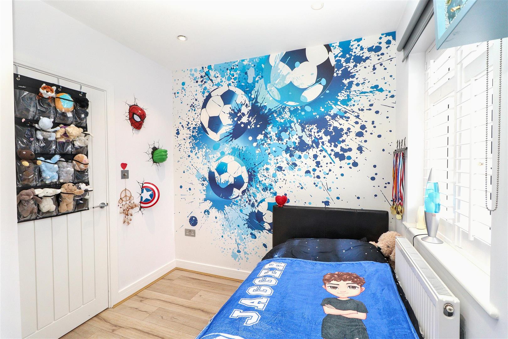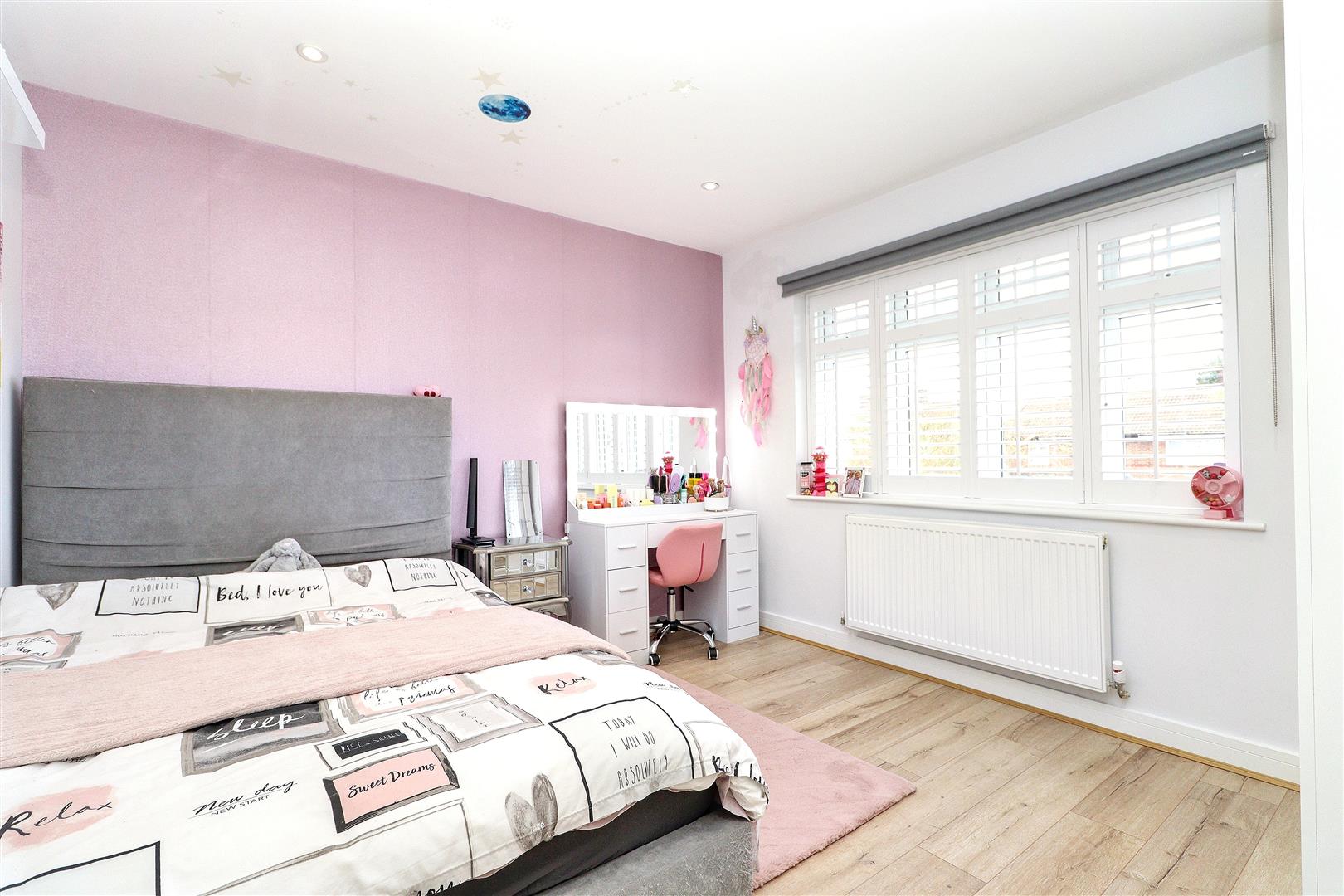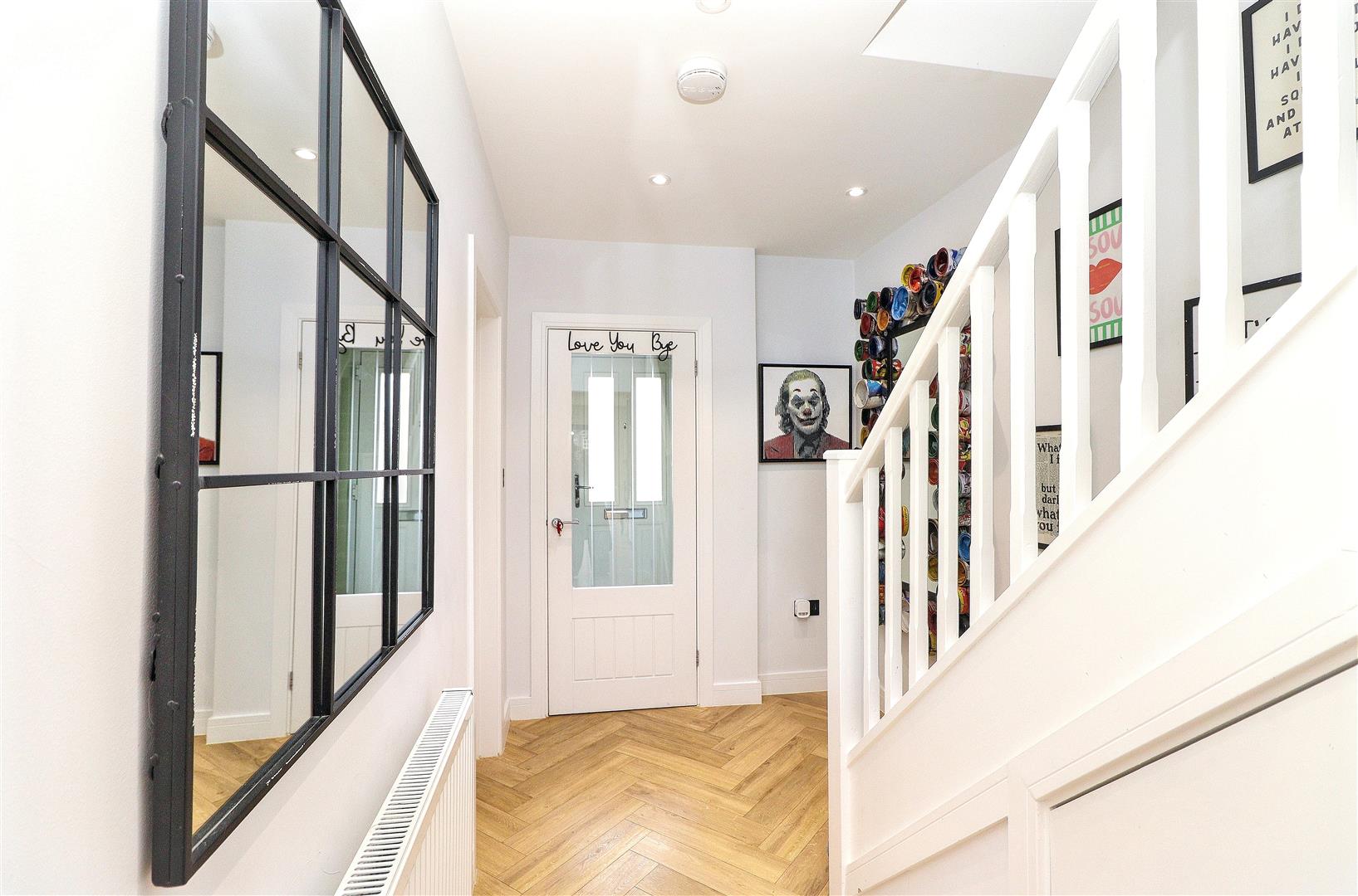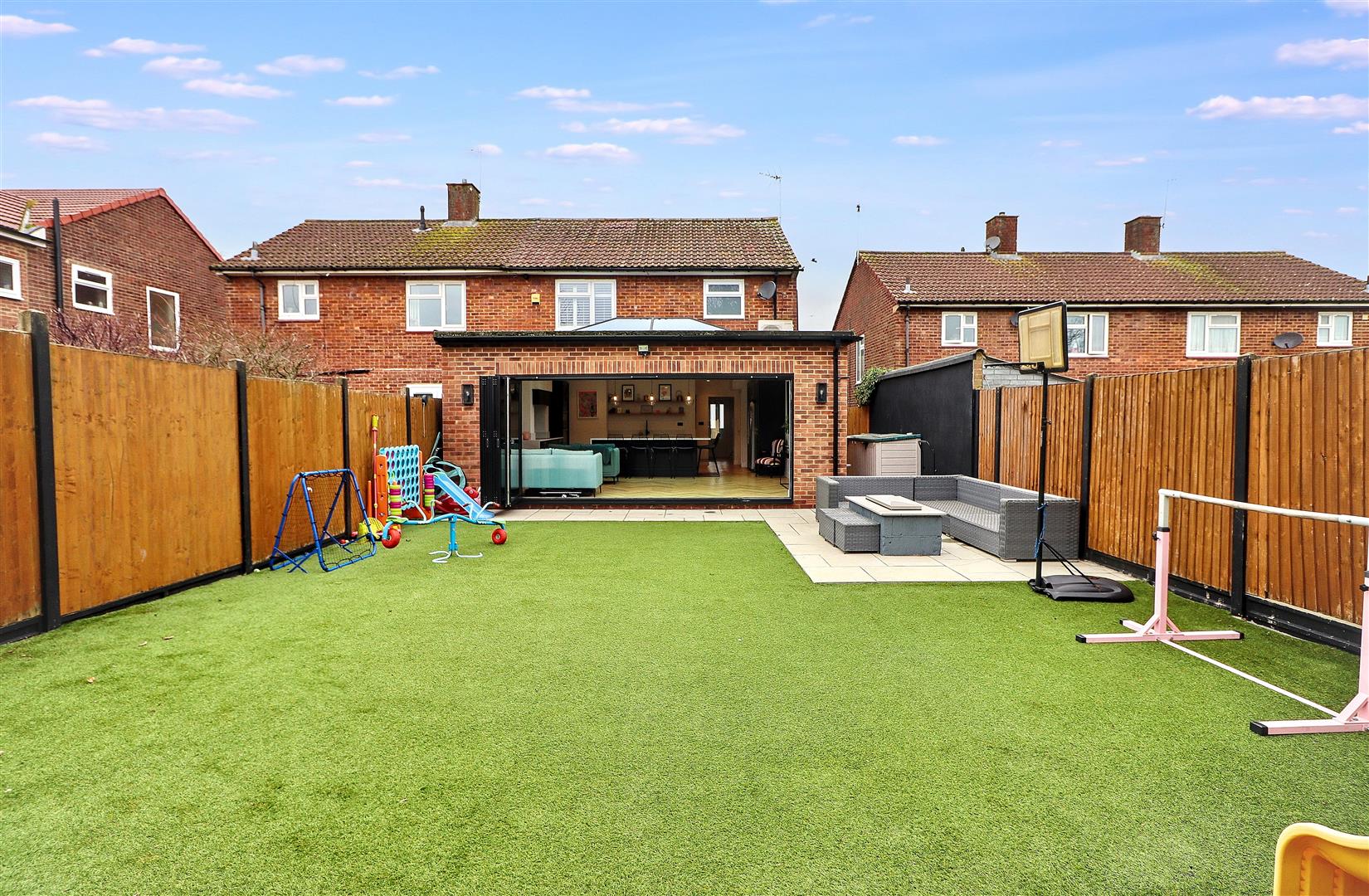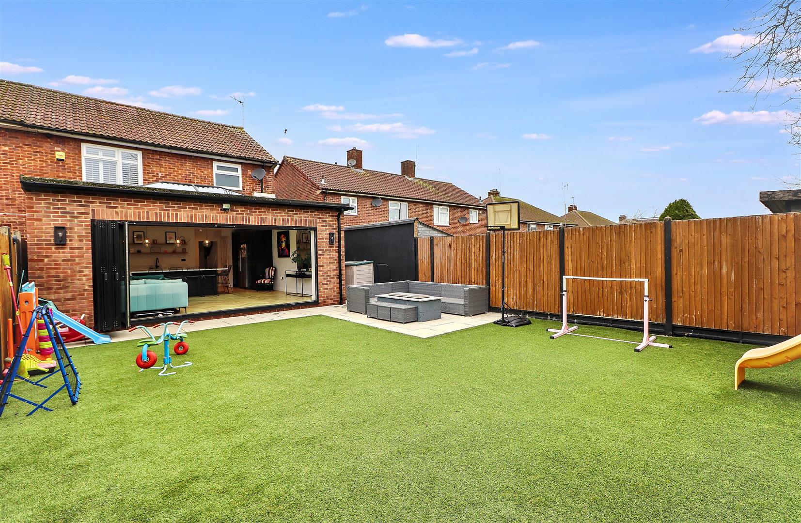 Externally, the low-maintenance artificial grass rear garden features patio seating areas and a gas firepit. The front driveway provides off-street parking for two cars.