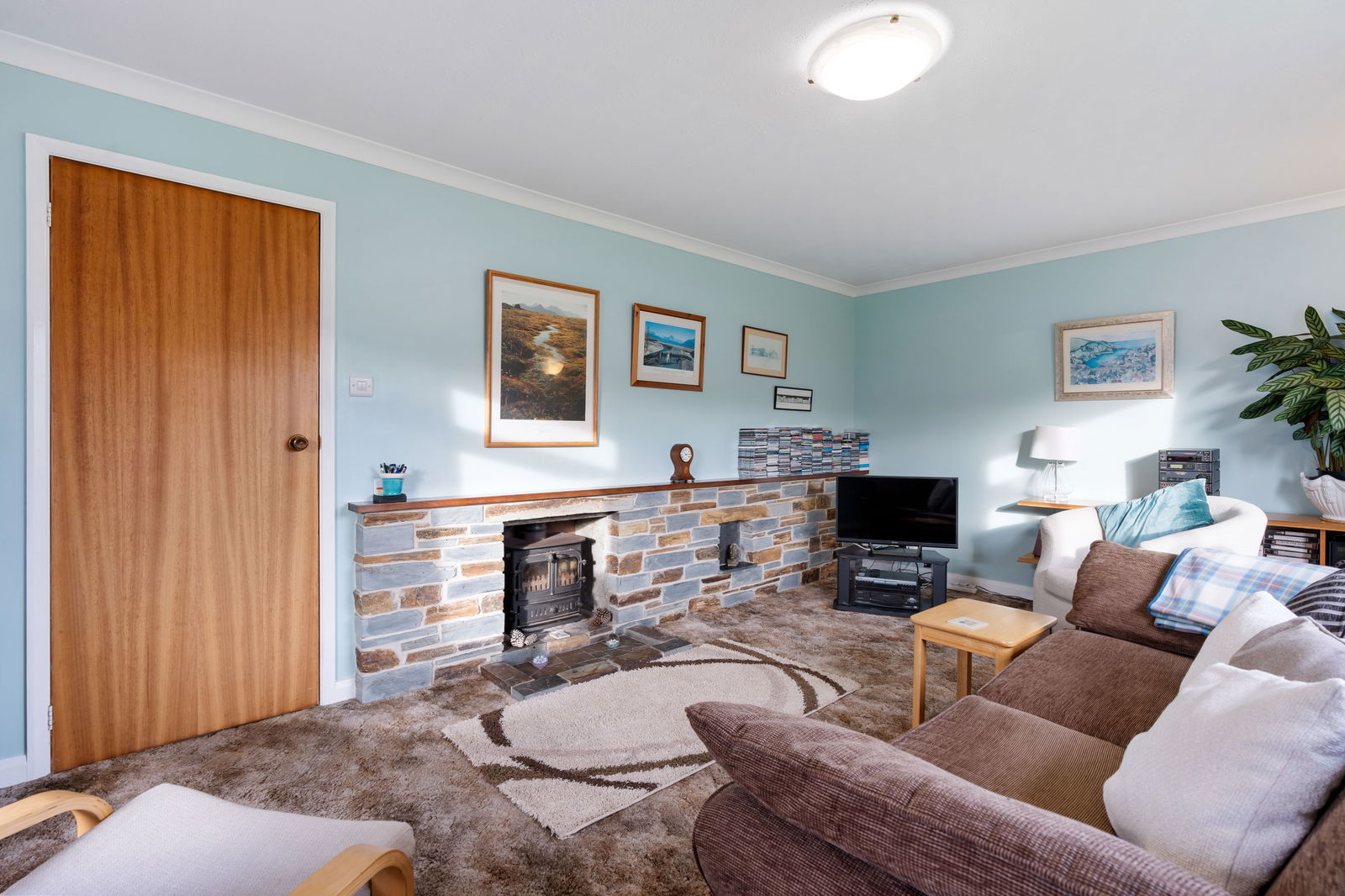 Light dual aspect with double glazed windows in UPVC frames to front and side. Feature woodburner set in cut stone fireplace and surround. Radiator. T.V. point.