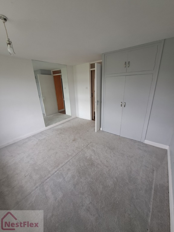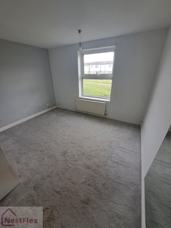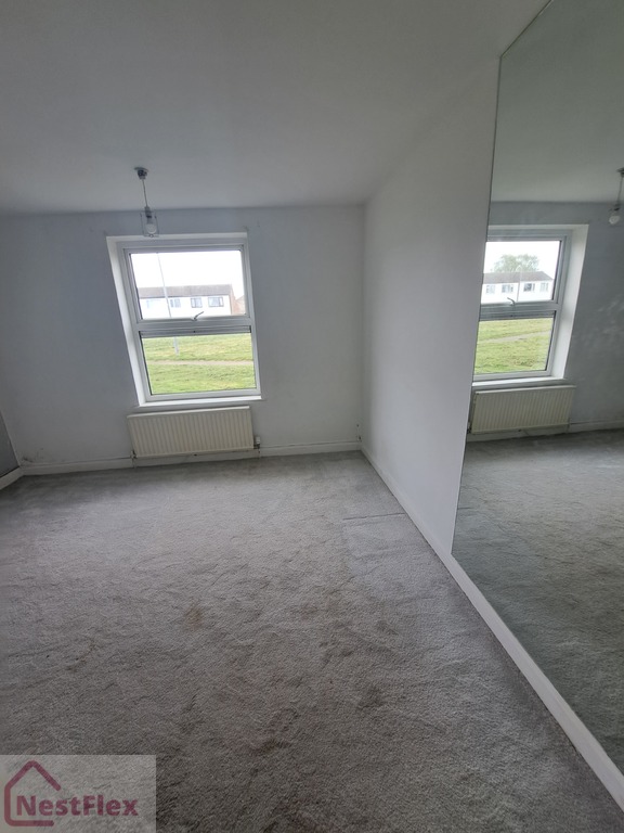 A double bedroom with a radiator, a UPVC window to the rear, and built in wardrobes.