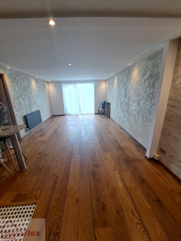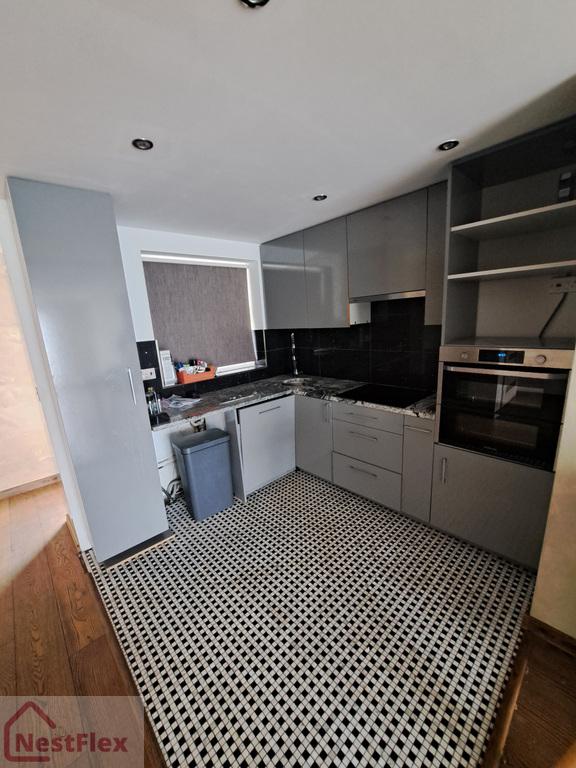 The kitchen area is situated in one corner of the space and has a range of base and wall mounted units. There is a built in oven, integral hob, extractor fan, plumbing for dishwasher and/or washing machine Sink unit set in to quartz worktops. Mosaic tiled style flooring. Breakfast bar with quartz worktop.