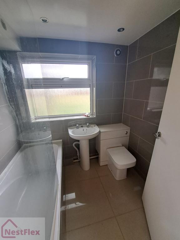 With tiled flooring, a upvc window, wash hand basin, low level wc, panelled bath with shower mixer taps, spotlights and a heated towel rail