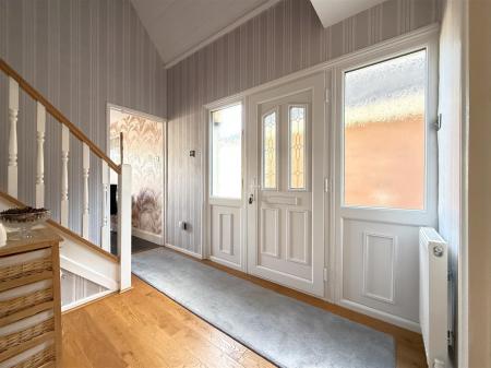 Initial Entrance Hall - 3.20m x 2.67m into stairwell (10'6" x 8'9" into st - A pleasant initial entrance vestibule having attractive high vaulted ceiling with exposed purlins, spindle balustrade turning staircase rising to a first floor galleried landing above with useful under stairs storage cupboard beneath, engineered oak flooring, central heating radiator and further oak internal doors leading to: