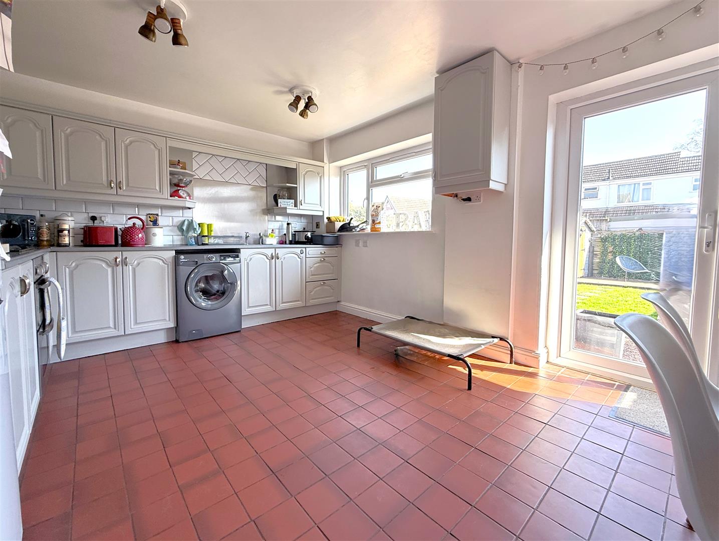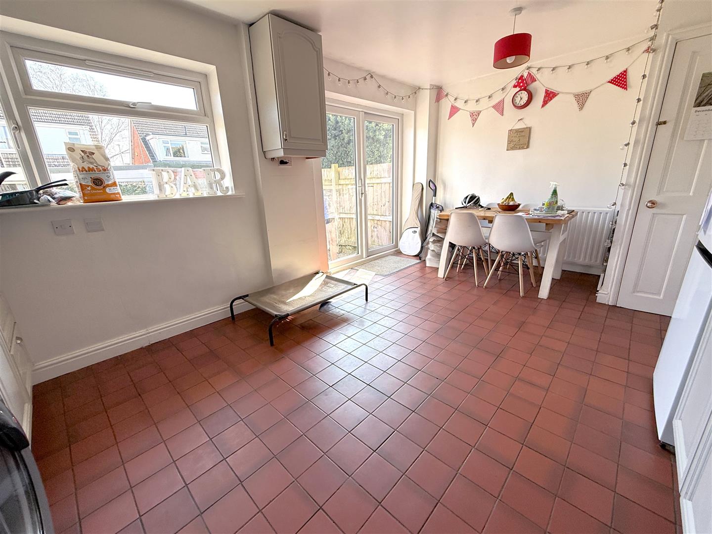 Open Plan Dining Kitchen - 5.08m x 3.43m (16'8" x 11'3") - A generous room overlooking the rear garden and large enough to accommodate an initial dining area with a built in cupboard and being open plan to the kitchen. The kitchen is fitted with a range of wall, base and drawer units with an L shaped configuration of laminate preparation surfaces; inset sink unit, plumbing for washing machine, low level oven and space for free standing fridge freezer; quarry tiled floor and double glazed window and French doors leading out into the rear garden.