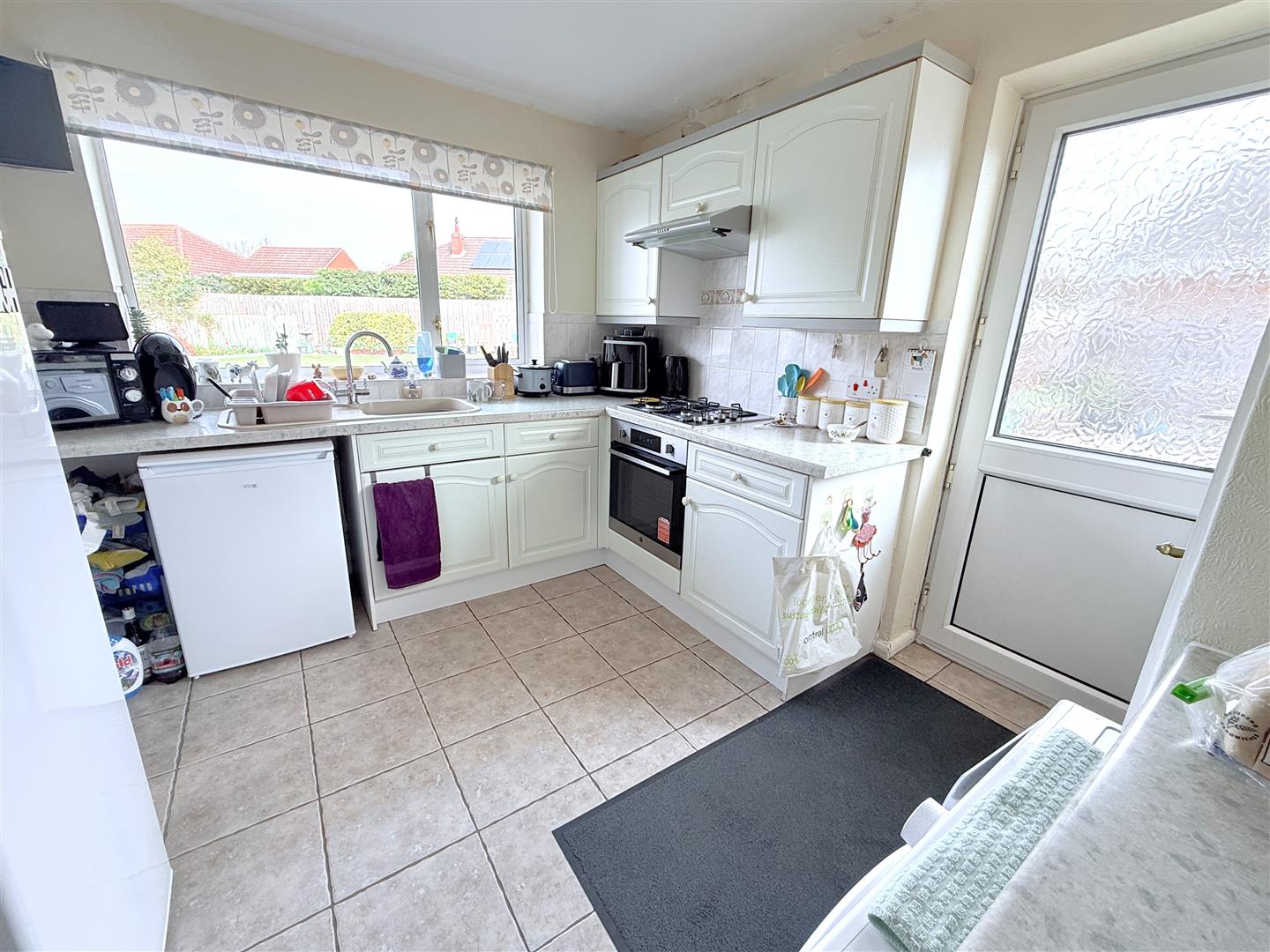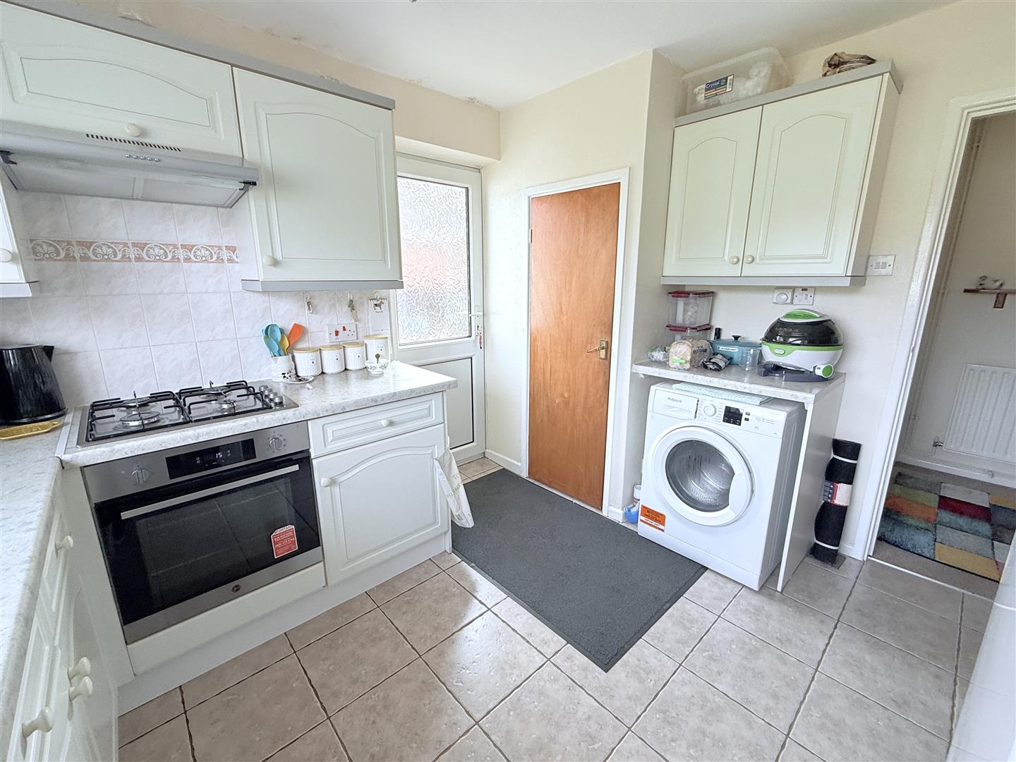 Kitchen - 3.33m x 2.90m (10'11" x 9'6") - Having fitted wall, base and drawer units; two runs of laminate work surface, one with inset sink and drain unit with chrome mixer tap and tiled splash backs; plumbing for washing machine, space for under counter fridge, built in oven with four ring gas hob over, built in pantry providing useful storage, tiled floor, double glazed window overlooking the rear garden and further double glazed exterior door to the side.