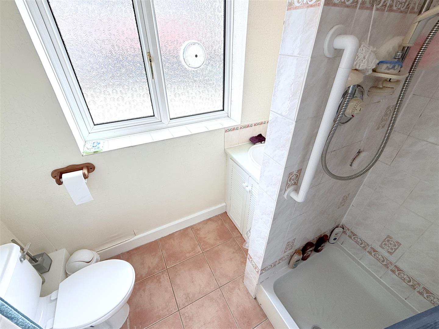 Shower Room - 2.21m max x 1.91m max (7'3" max x 6'3" max) - Having a suite comprising shower enclosure with tiled surround and wall mounted Mira shower mixer, close coupled WC and vanity unit with inset tear drop washbasin, chrome taps and tiled splash back; central heating radiator and double glazed window to the side.