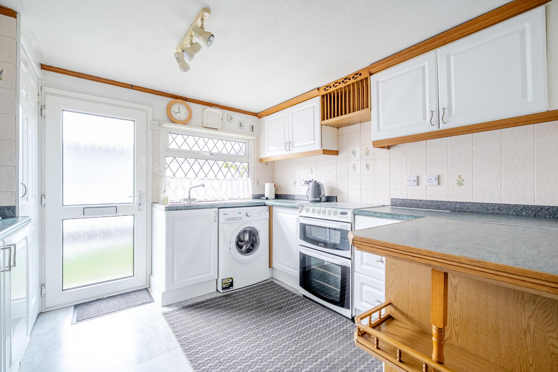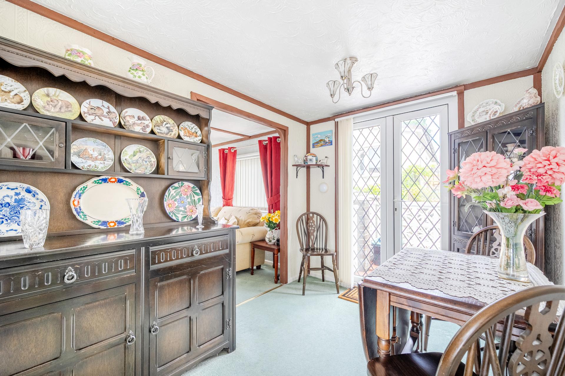 The inviting home has a light and airy kitchen fitted with a range of white fronted wall and base units with worktops over incorporating a stainless steel sink with mixer tap over and spaces for a cooker, washing machine and fridge and a freezer. A storage cupboard houses the gas boiler which serves the hot water and central heating. The through dining room with patio doors leading out to the side garden and a wide opening allows access into the dual aspect sitting room, with two large windows to the front and one overlooking the side. A wooden fire surround houses living flame electric fire giving a warming focal point to the room.
