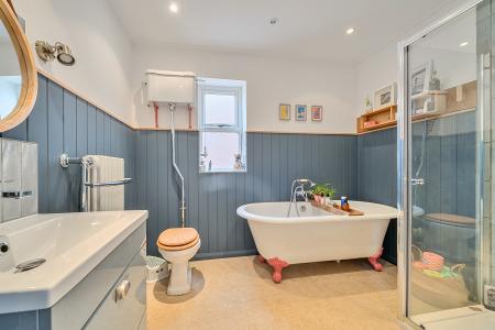 Upstairs, you'll find five bedrooms. The principal bedroom boasts a walk-in wardrobe and an en-suite shower room with a vanity basin, WC, and shower cubicle. The family bathroom is well-appointed with a clawfoot bath and antique-style mixer tap with handheld shower, a separate shower cubicle, WC, and vanity basin.