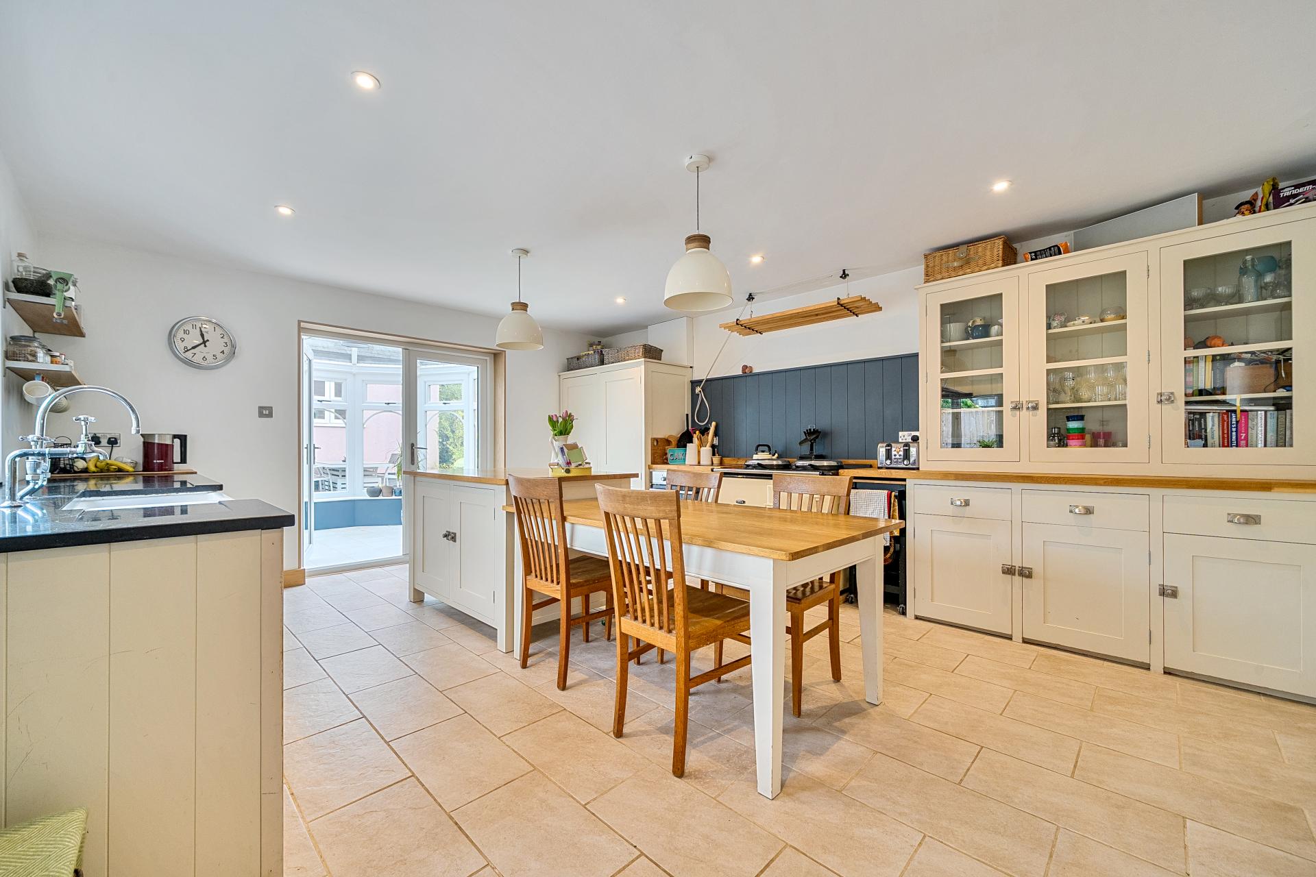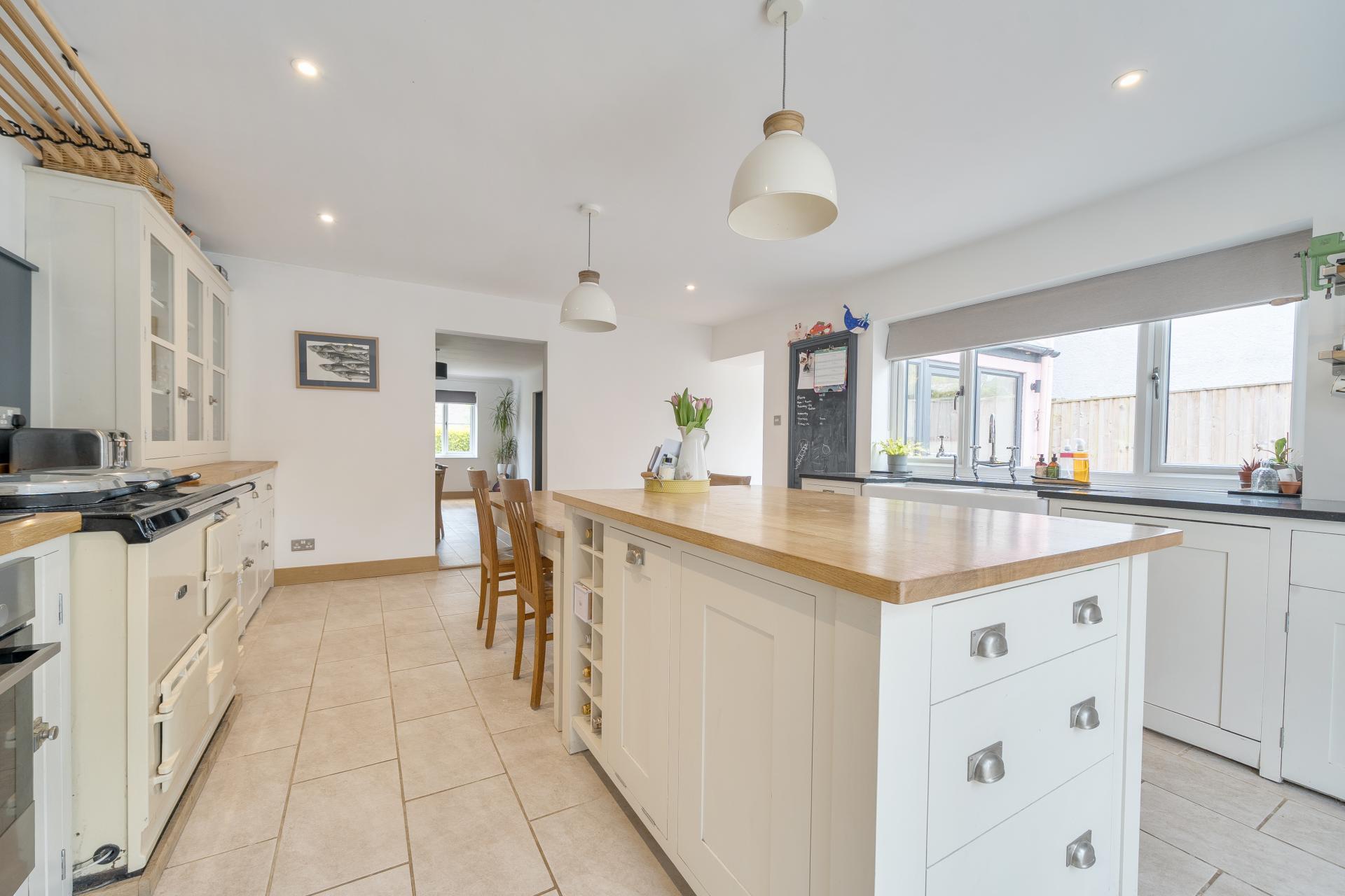 A glazed front door with matching side panels opens into a welcoming entrance hall with stairs to the first floor. From here, you step into the expansive kitchen/breakfast room, which is fitted with pale cabinetry and wooden worktops. A double Belfast sink with mixer and filtered water taps sits beneath a window, while cooking facilities include an oil-fired Aga, integrated oven, hob, fridge, and dishwasher. A central island offers additional workspace and storage, and there's plenty of room for a large family dining table. Patio doors lead into a bright conservatory, ideal as a garden-view retreat or children's playroom,with doors opening directly into the garden.