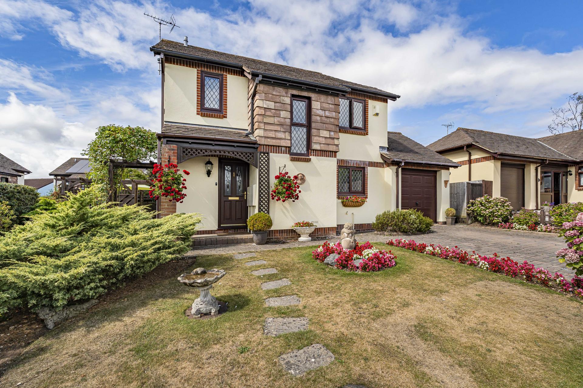 The beautifully maintained front garden offers a warm welcome with its vibrant flower beds and hanging baskets. The space is bursting with colour and character, providing excellent curb appeal. The rear garden has been landscaped, offering a variety of well-maintained shrubs, colourful planting, and mature trees. A paved patio area, ideal for outdoor dining, sits beneath a charming arbour, while multiple seating areas invite you to relax and enjoy the surroundings. The side garden is equally picturesque and provides access between the front and rear of the property.