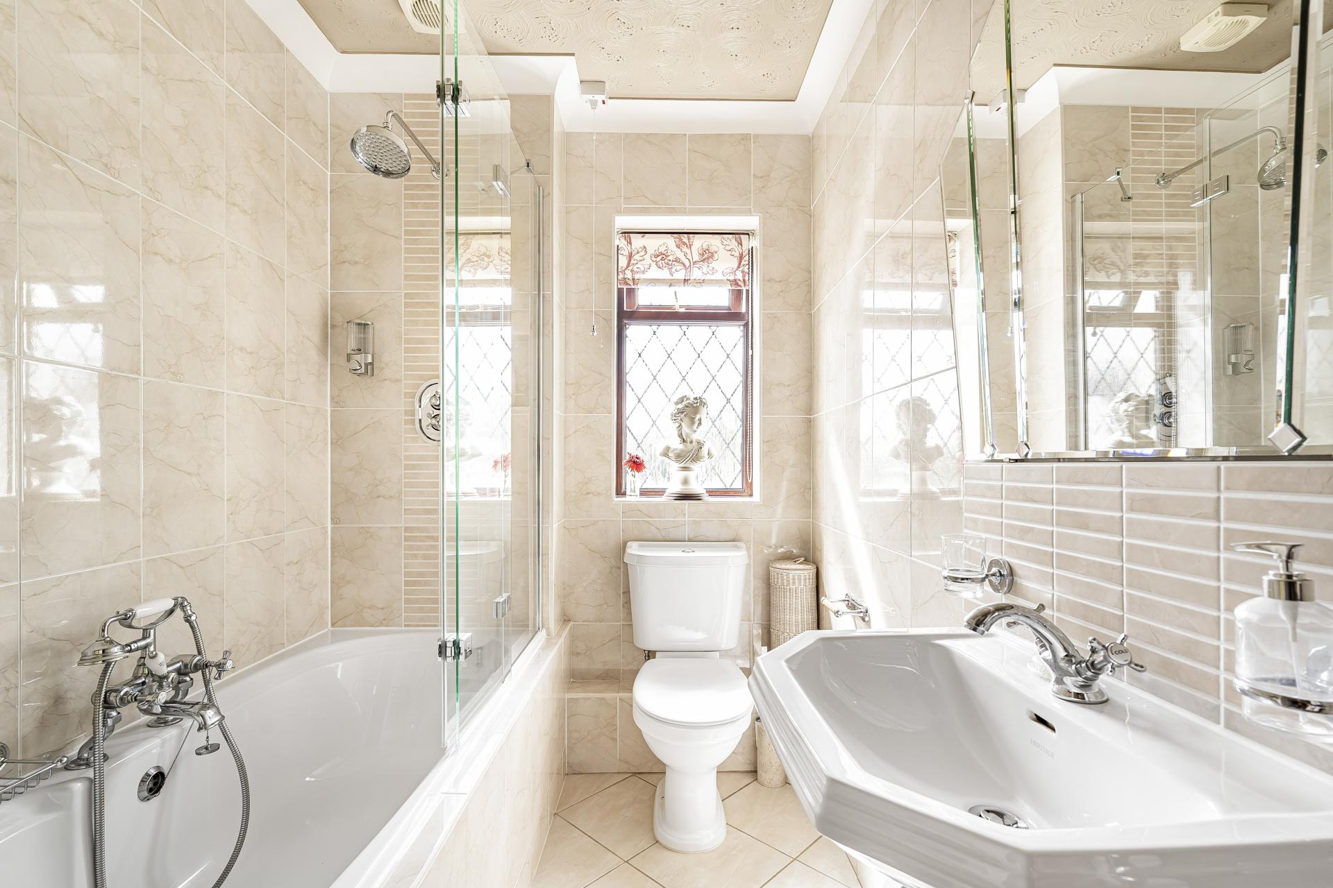 A beautifully presented landing with a feature chandelier and gallery balustrade provides access to four well-proportioned bedrooms and the family bathroom. The principal bedroom is a generous size and includes fitted wardrobes. There are three further bedrooms, two doubles and a well-proportioned single bedroom which is currently utilized as an office. The family bathroom has been finished to a high standard, featuring a classic white suite with a bath and overhead rainfall shower, chrome fittings, and full-height tiling in warm tones.