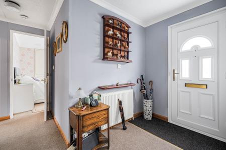 The property features a welcoming entrance hallway leading into a spacious dual-aspect sitting room, filled with natural light from its large bay windows. The adjoining dining area provides a comfortable space for entertaining or family meals, with pleasant views over the surrounding park.