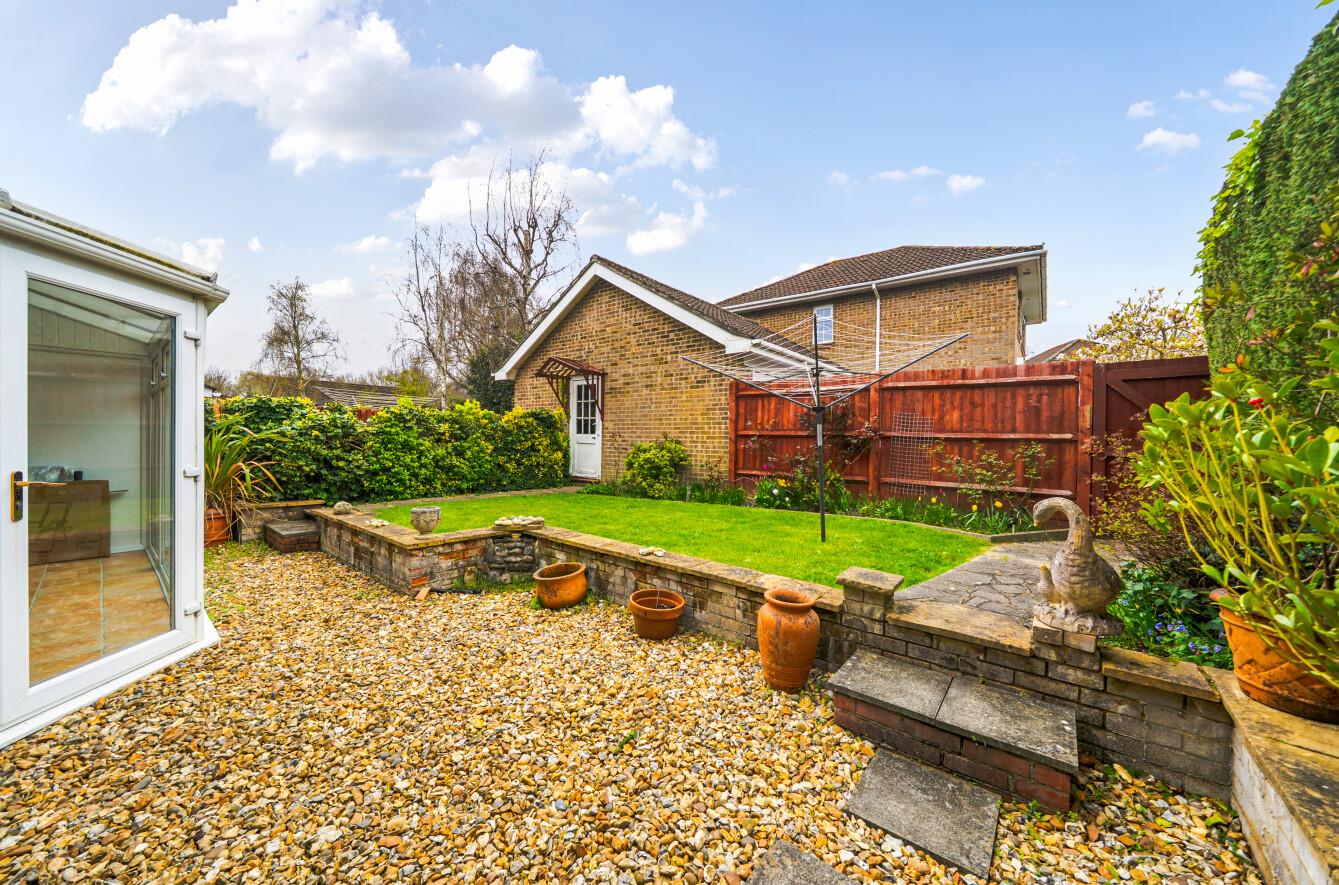 Rear: - Shingled area with path leading to raised garden area with lawn area, flowerbeds bordering and path leading to rear gate for access to driveway and garage.