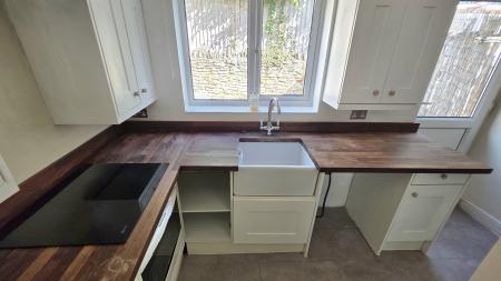 A part glazed door opens into the sitting room with a window overlooking the front garden. An attractive brick fireplace with a wood-burning stove provides the central focal point of the room together with stairs rising to the first floor and open plan access to the kitchen. This room has a range of fitted units, a four-ring electric hob and an under-counter oven. A part glazed door opens onto the courtyard garden.