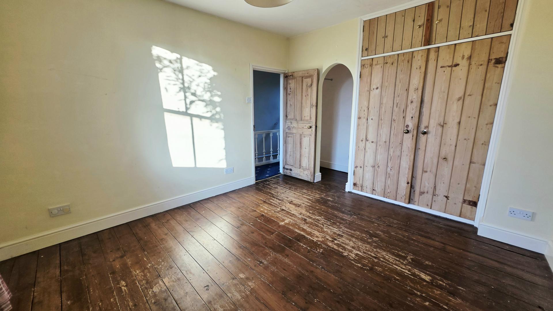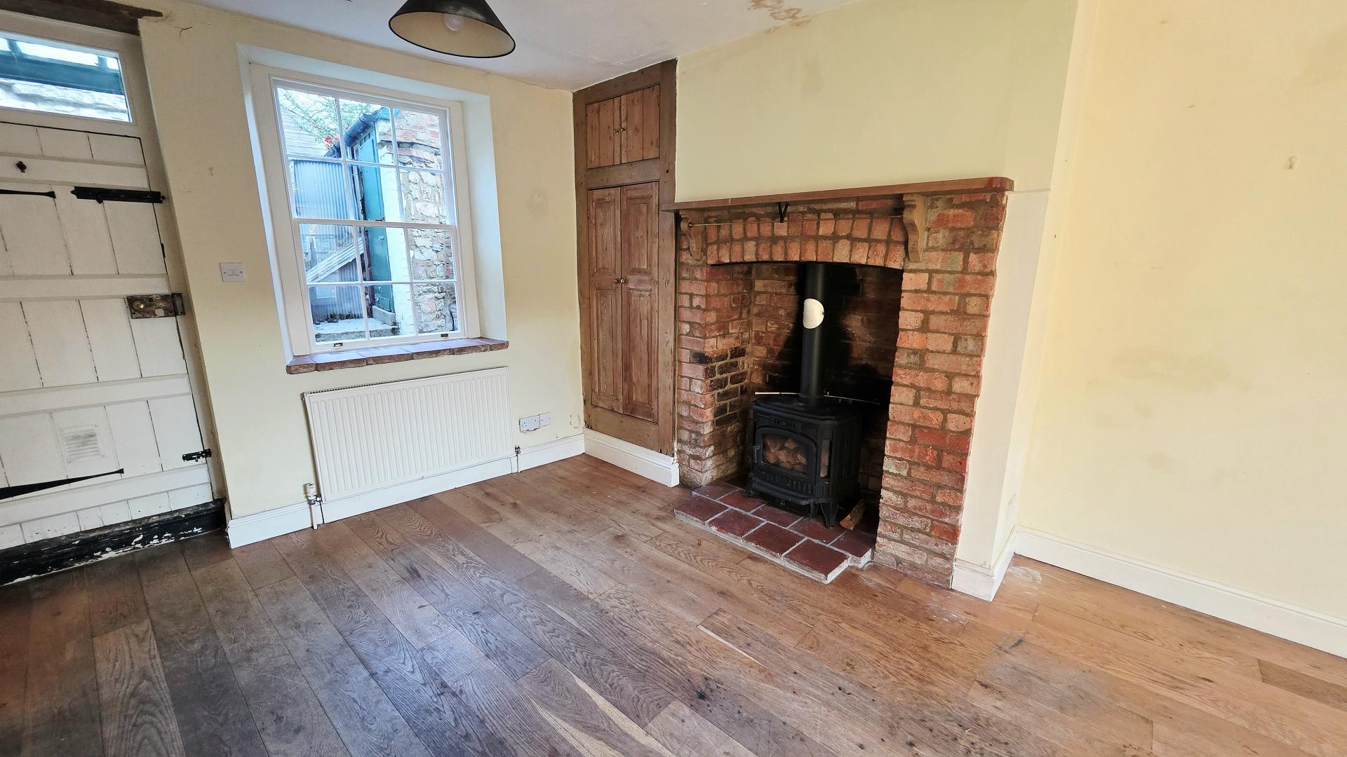 From the entrance hall, stairs rise to the first floor and a panelled door opens into a large reception room with sash windows to the front and rear aspects together with a door leading to the rear courtyard. A brick fireplace with a cast iron wood-burning stove provides the main feature to the room. The kitchen is in need of updating but currently comprises of a small range of fitted units and worktops together with a useful pantry cupboard.