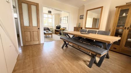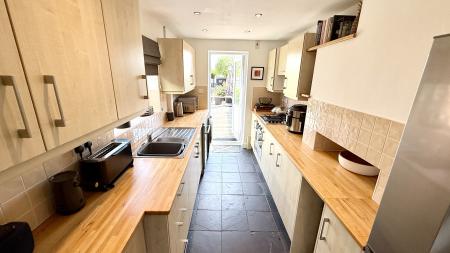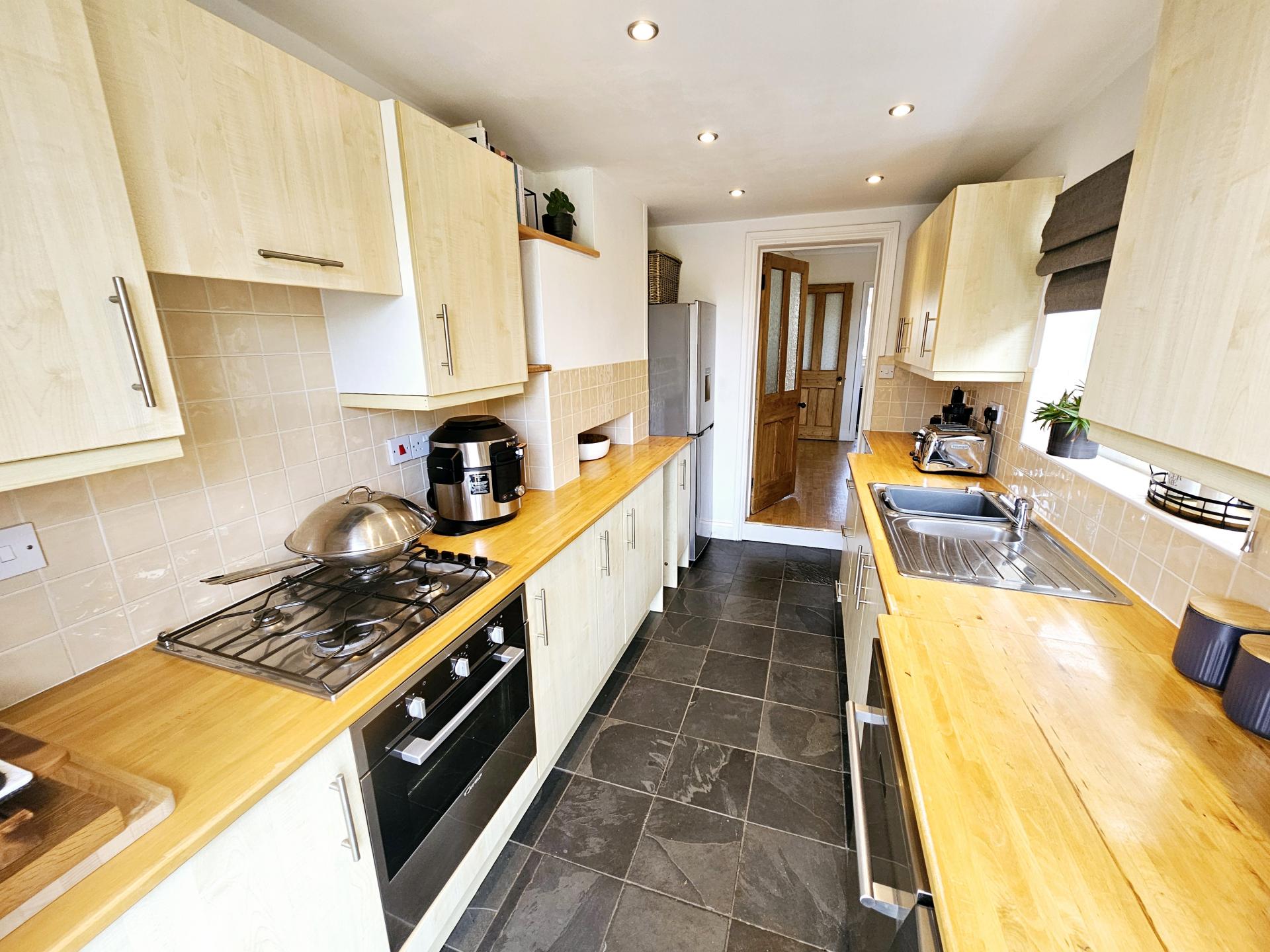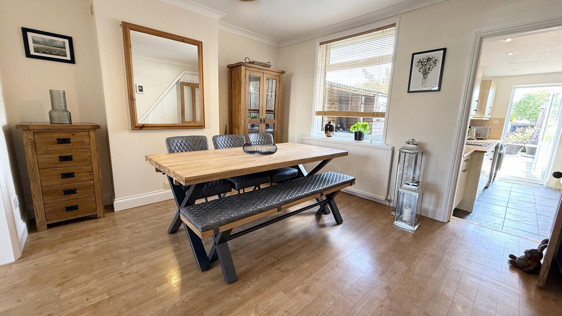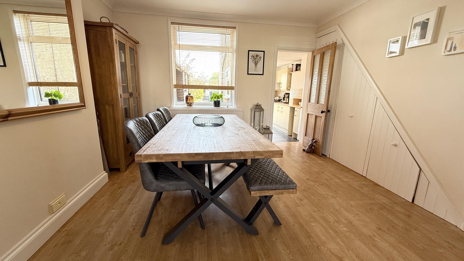 From the entrance hall, stairs rise to the first floor and a door opens into the second reception room, currently arranged as a dining room. This space includes extensive understairs storage and open access to the sitting room, which features a bay window and a character fireplace. The kitchen is fitted with modern units, an under counter oven, a four ring hob, and provides direct access to the garden.