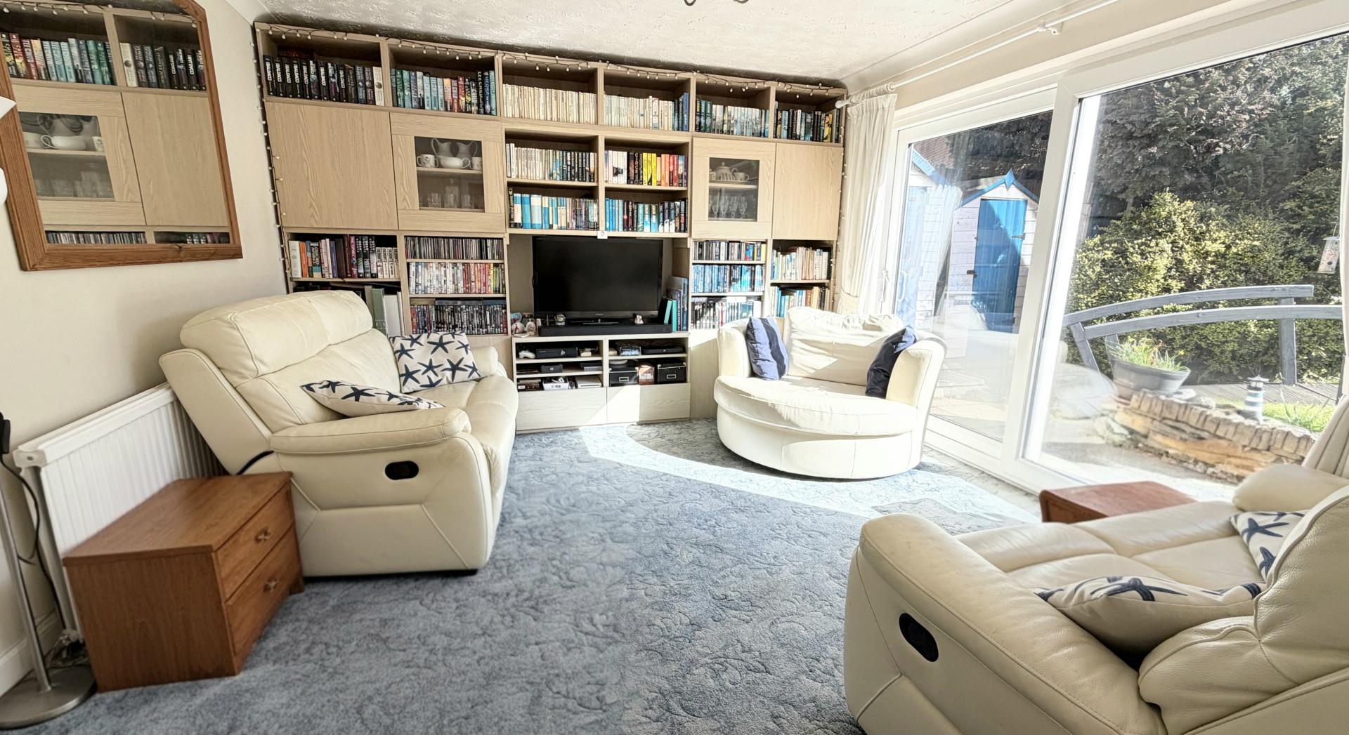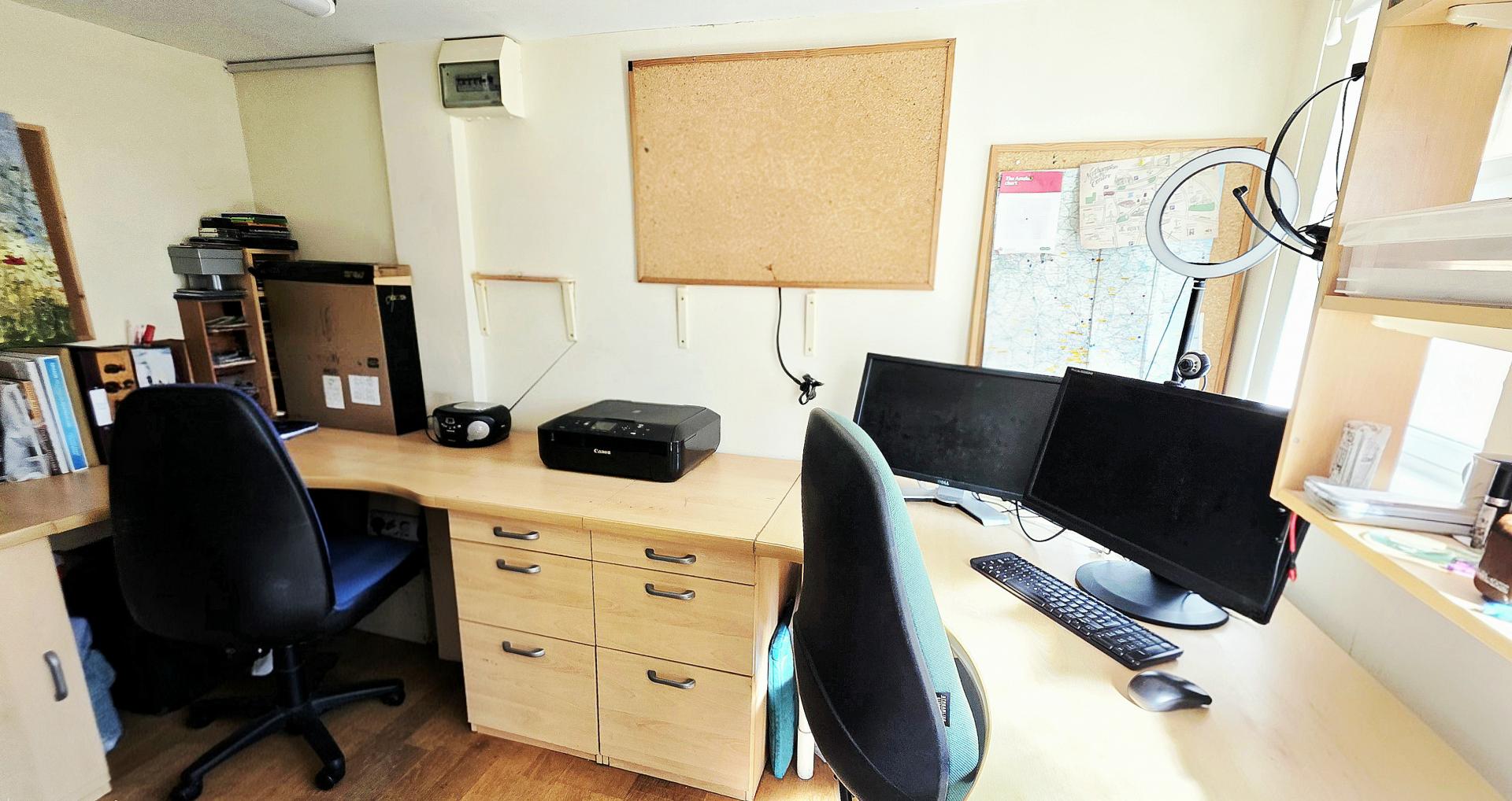 Outside, the property includes a small front garden and a driveway leading to a converted garage providing an office with a rear door and a useful store. An electric vehicle charging point is installed. Additional hardstanding to the side offers further off road parking. The enclosed rear and side gardens extend to 16.45m (54ft) in width and feature an south easterly aspect, a paved patio, a lawn with well stocked beds, gated access, and exterior lighting.