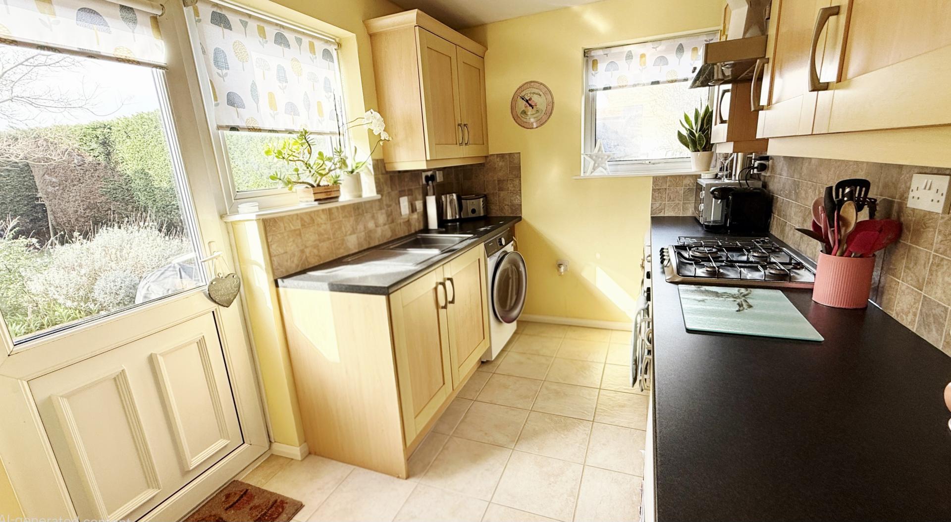 From the entrance hall, a door opens into the living room with a window to the front aspect and a turning staircase rising to the first floor with a useful storage cupboard under. The kitchen has a range of units, fitted four ring gas hob and under-counter oven together with spaces for additional appliances. There are windows to the side and rear aspects and a part glazed door leading to the rear garden.