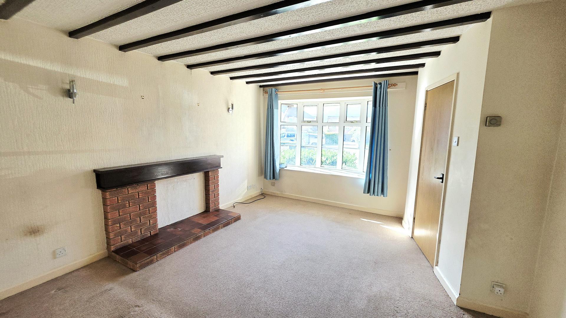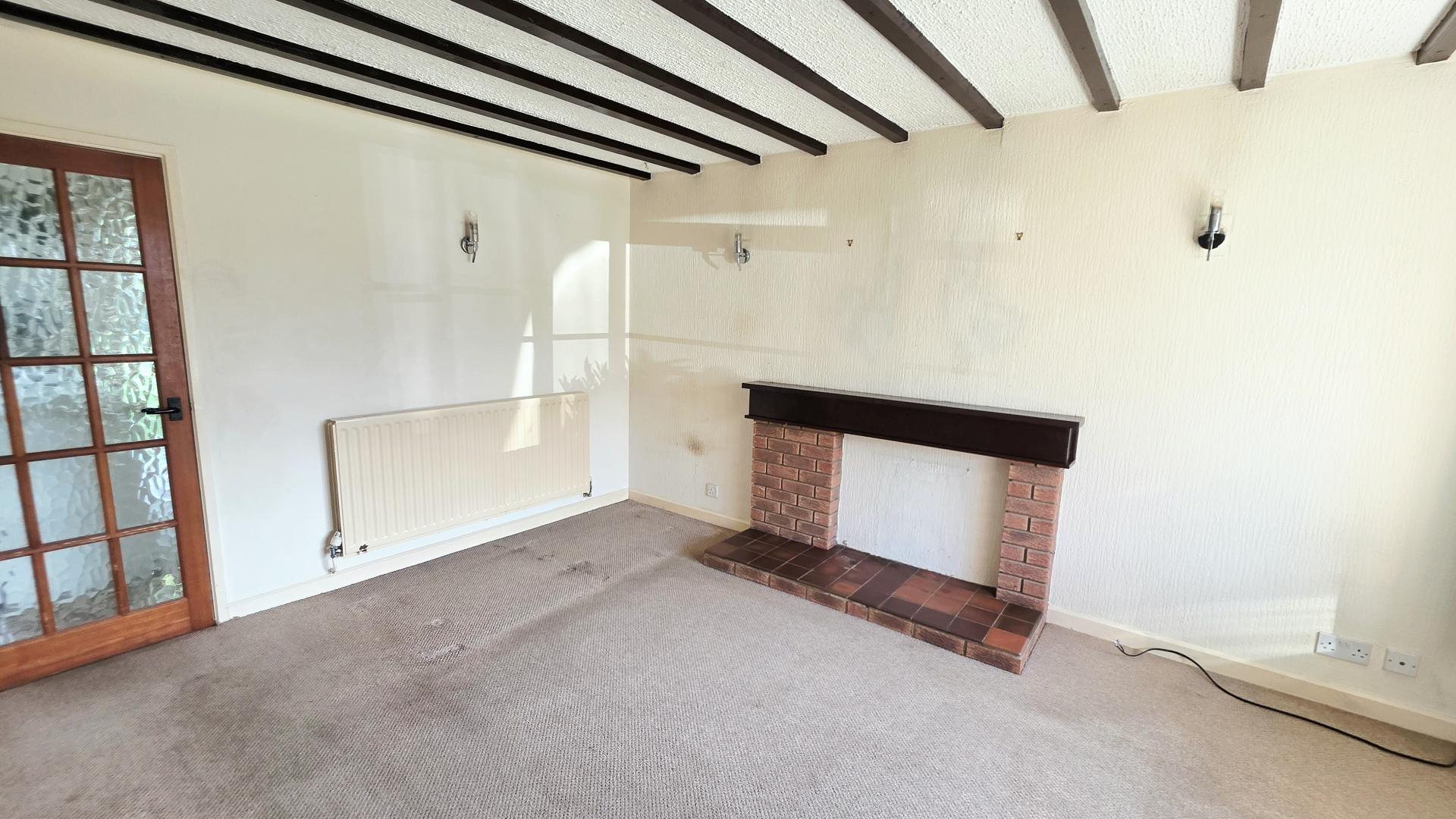 The accommodation begins with an entrance hall, where stairs rise to the first floor and doors lead to the principal ground-floor rooms. The living room features a bow window to the front aspect, allowing for plenty of natural light, and includes an ornamental fireplace. The open-plan kitchen/dining room is fitted with a range of units (now dated) and offers ample space for a table and chairs. A useful understairs pantry cupboard provides additional storage, while double casement doors open directly onto the rear garden.