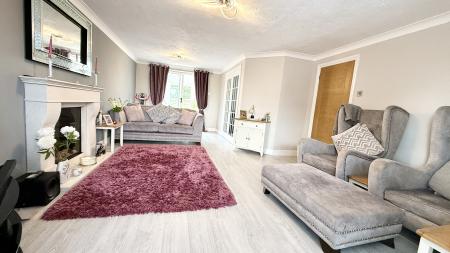 From the entrance hall, a turning staircase rises to the first floor galleried landing and doors lead to the adjoining rooms. The living room is particularly noteworthy, with a walk-in bay window to the front aspect. The central focal point of the room is a stone fireplace with a living flame gas fire. Sliding patio doors lead to a conservatory with casement doors opening onto the landscaped gardens.