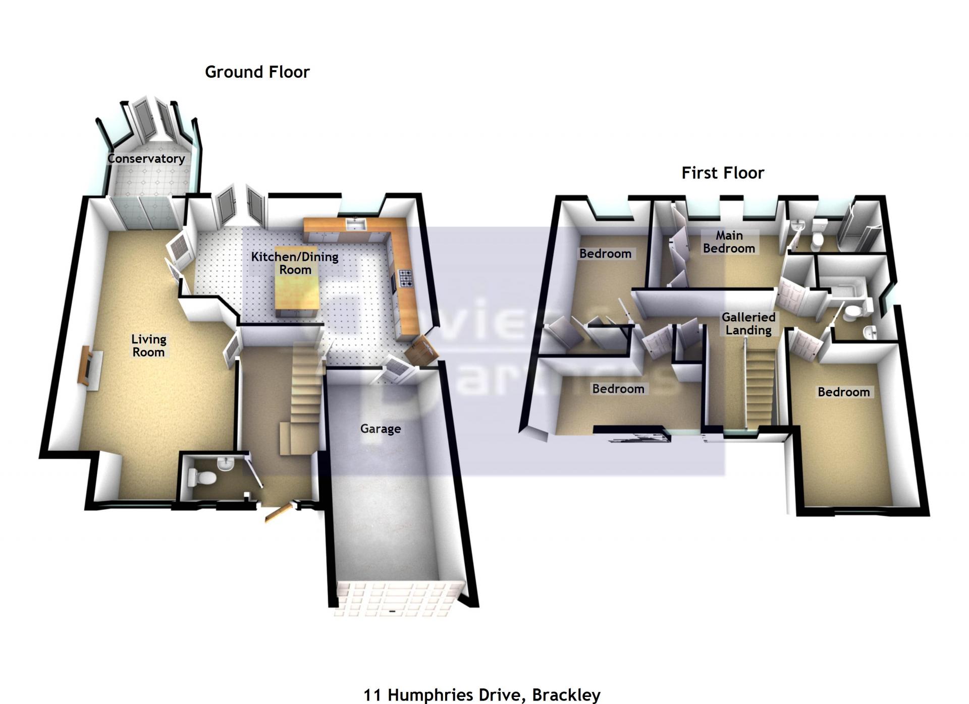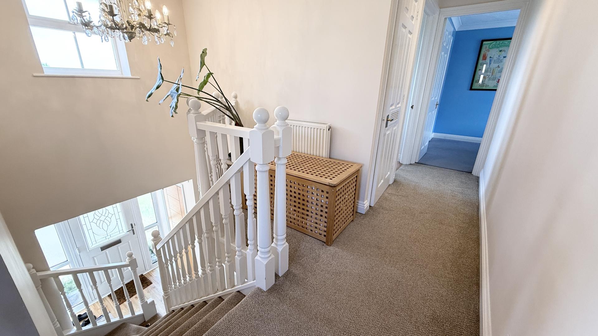 A galleried landing overlooks the entrance hall together with doors leading to the adjoining rooms. There is an en-suite main bedroom and three further well-proportioned bedrooms, two of which have built-in double wardrobes together with a three piece white bathroom suite.