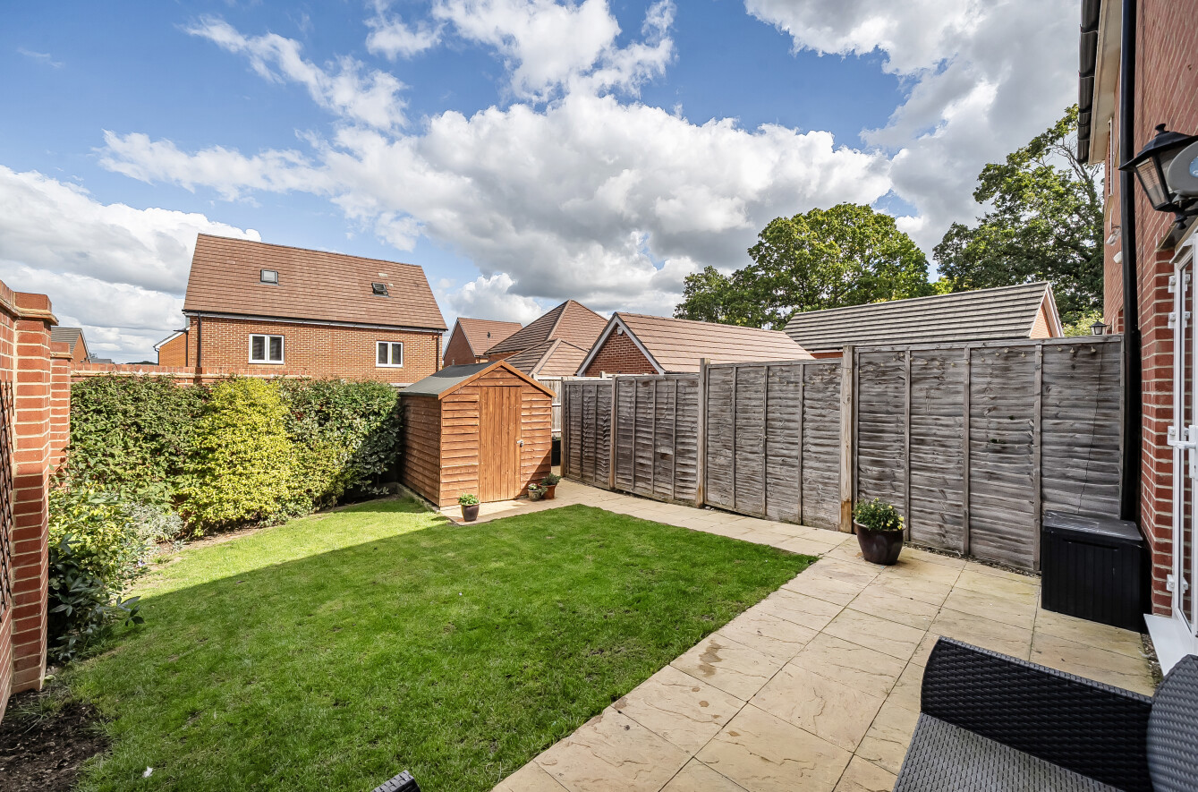 Moving towards the rear of the property is the living room which offers views over the rear garden and French doors onto the patio area and a turfed lawn, with additional shed and also rear access.