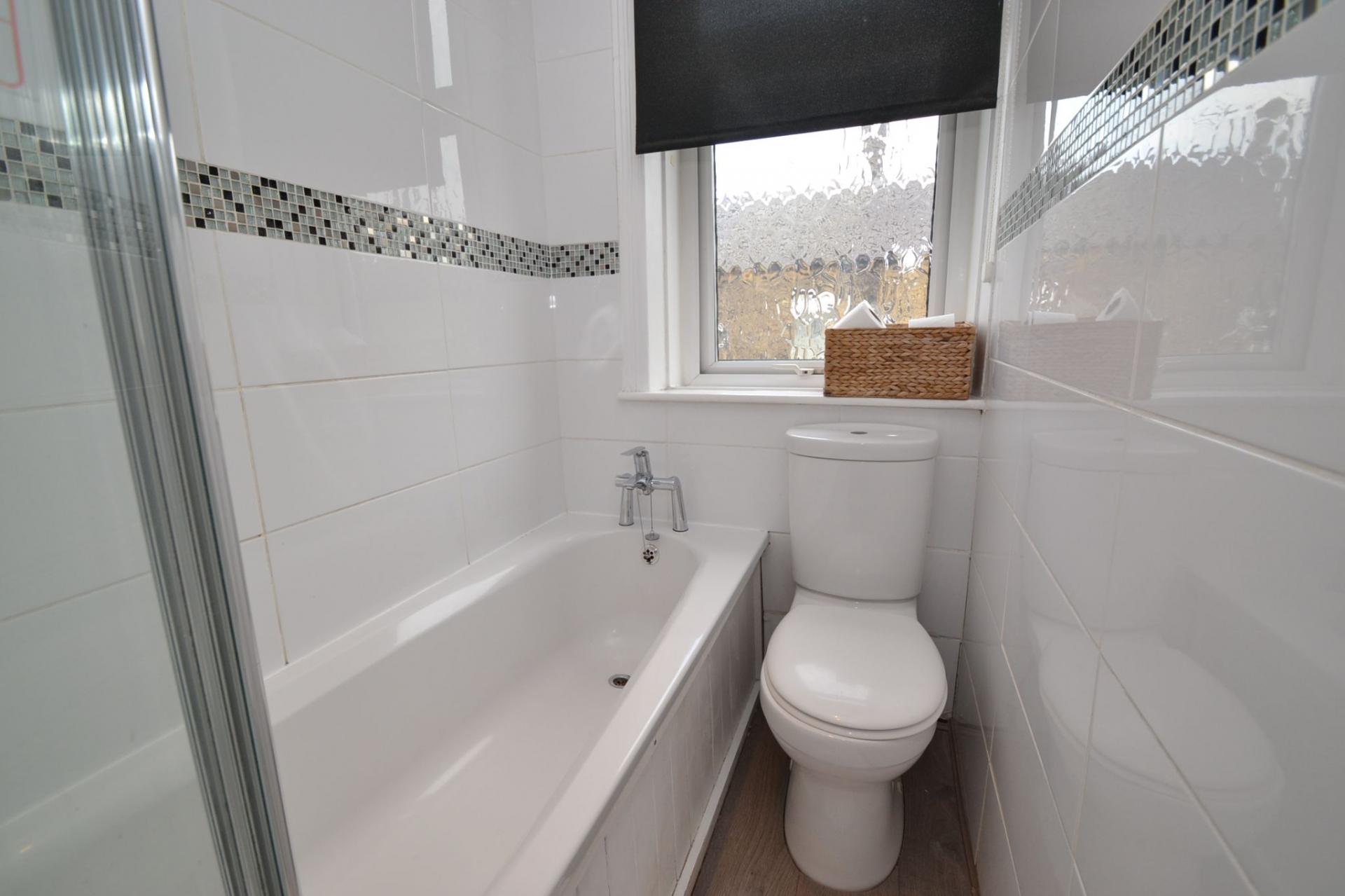 Bathroom: Three piece modern suite in white, fully tiled, fold back shower screen, wash basin set on a high gloss vanity unit, chrome thermostatically controlled shower over the bath, cladded ceiling with inset ceiling lights, frosted Upvc dg window, radiator.