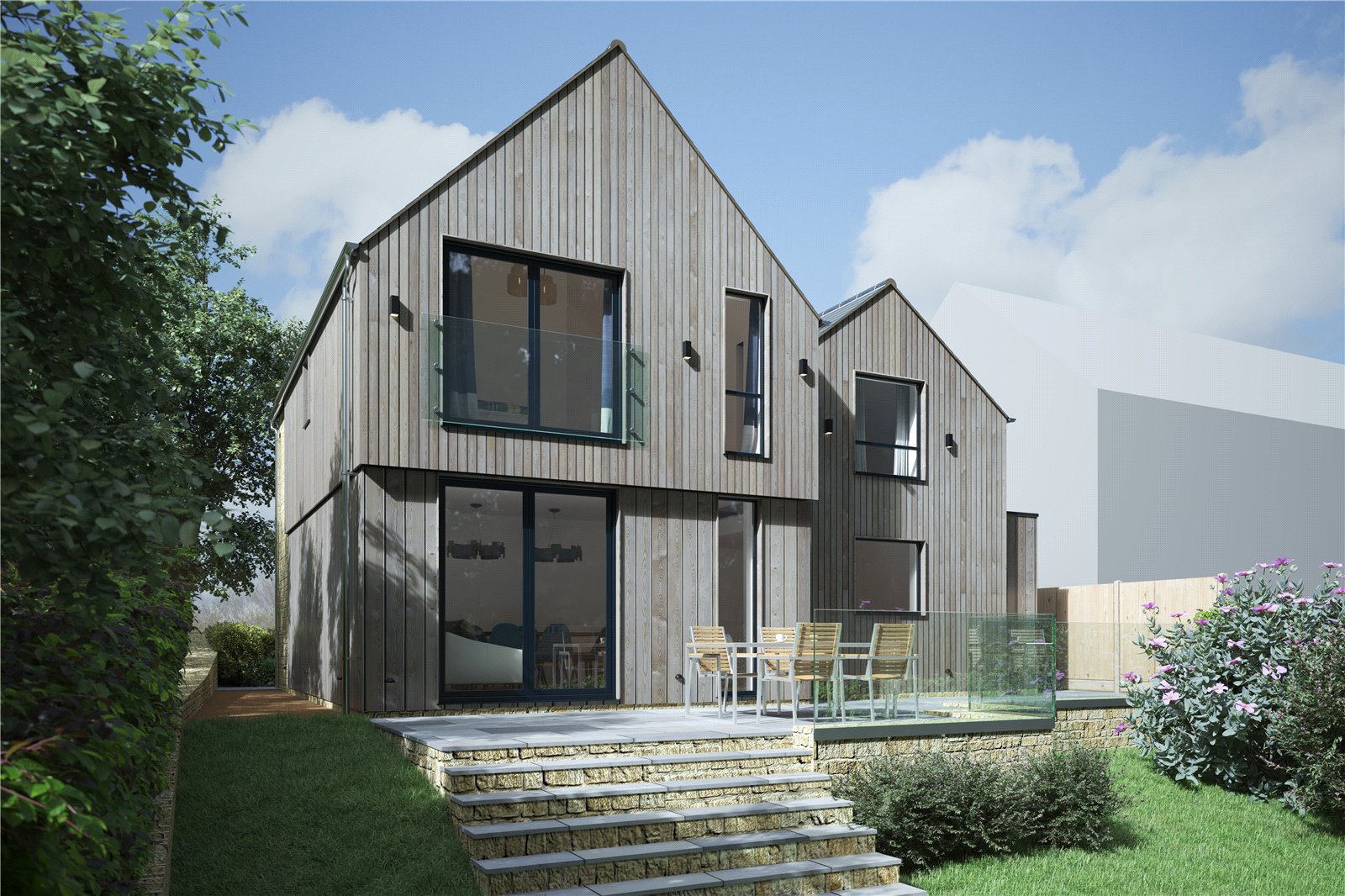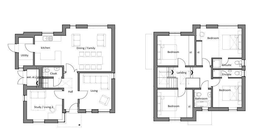 Current plans allow for a generous living space, with the ground floor benefiting from an ample study or playroom and separate living room. Towards the back you will find an enviable kitchen diner and utility room that spans the entire width and will boast an exceptional verdant outlook. Upstairs has been thoughtfully planned, with four very good-sized bedrooms, two of which have ensuites. All of which can be reconfigured to your needs.